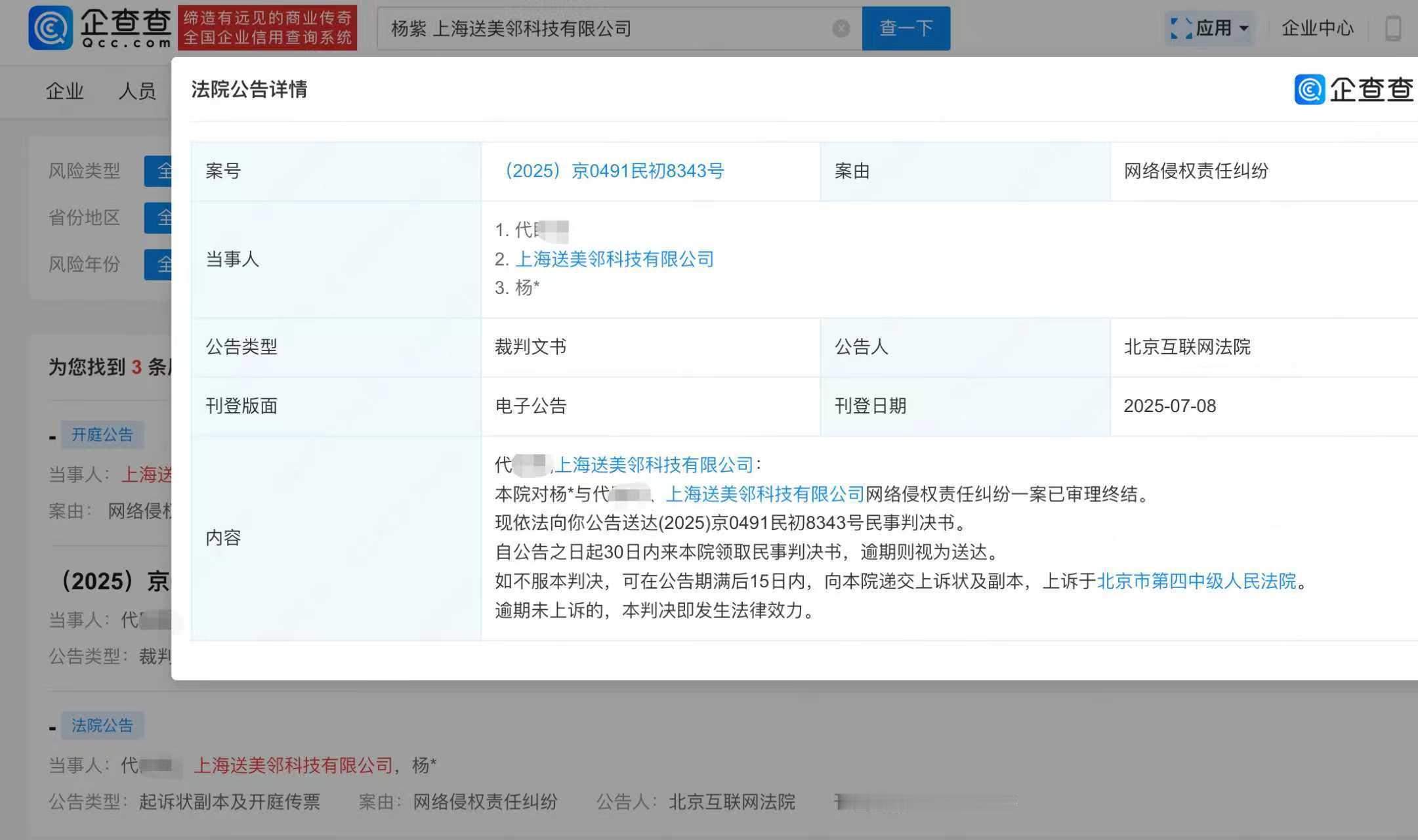 【】 企查查APP显示,近日,代某某等被强制执行2万元,执行法院为北京互联网法院。此前杨紫与其网络侵权责任纠纷于6月开庭审理,7月审理终结。