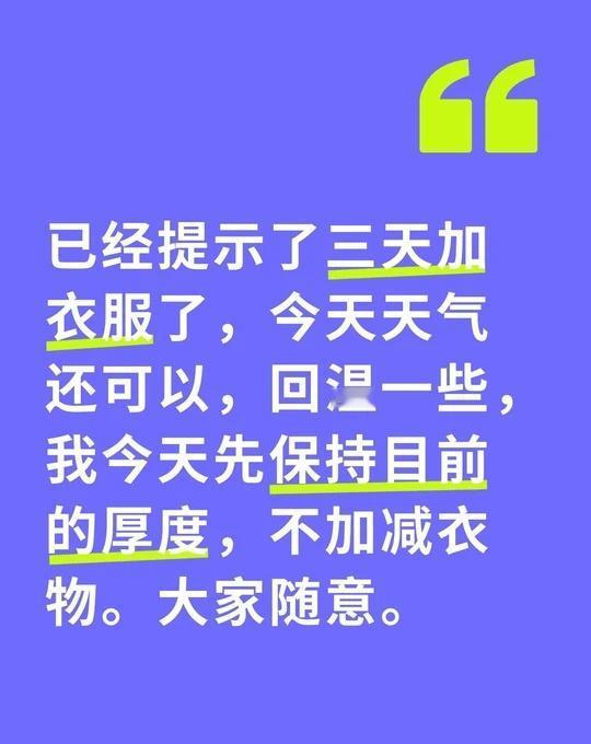 已经提示了三天加衣服了 已经提示了三天加衣服了,今天天气还可以,回温一些,我今天先保持目前的厚度,不加减衣物。大家随意。