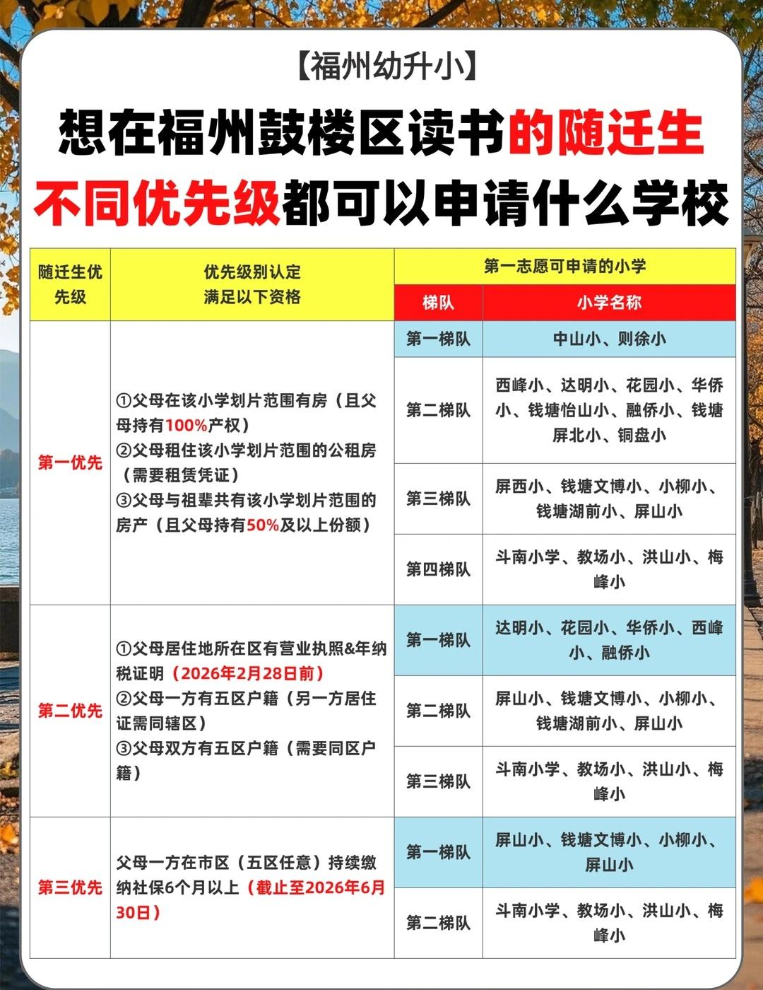 不同的优先级随迁生在鼓楼可以报什么学校 福州的随迁生总共分为三个优先级,然后再以优先级填报随迁志愿,优先级别越高,报名进该小学的概率就越高。 ✅随迁第一优先:①父母在该小学划片范围有房(且父母持有100%产权);②父母租住该小学划片范围的公租房(需要租赁凭证);③父母与祖辈共有该小学划片范围的房产(且父母持有50%及以上份额) ✅随迁第二优先:①父母居住地所在区有营业执照&年纳税证明(2026年2月28日前);②父母一方有五区户籍(另一方居住证需同辖区);③父母双方有五区户籍(需要同区户籍) ✅随迁第三优先:父母一方在市区(五区任意)持续缴纳社保6个月以上(截止至2026年6月30日) 小学 福州随迁生 福州上小学 福州