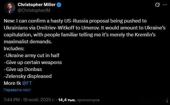 美国的新计划是让乌克兰投降,本次协议的要点包括:🔹 乌克兰军队减半🔹 放弃武器系统🔹 放弃顿巴斯🔹 承认俄语为官方国家语言来源:Christopher Miller