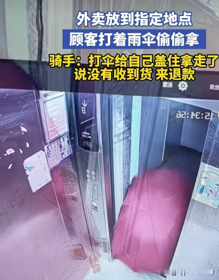 为了这三瓜两枣,人也不做了吗?一个顾客,为了能达到留货退款的目的! 她让外卖小哥,把餐食放到了电梯口!她等人走后,就打着伞遮住面部,把餐拿走了! 然后,再在平台上投诉,她没收到食物,要赔偿或退款!人有无耻的,却第一次看到,如此厚颜无耻的! 君子爱财,取之有道!这个顾客的行为,简直是太跌份了!友友怎么看?