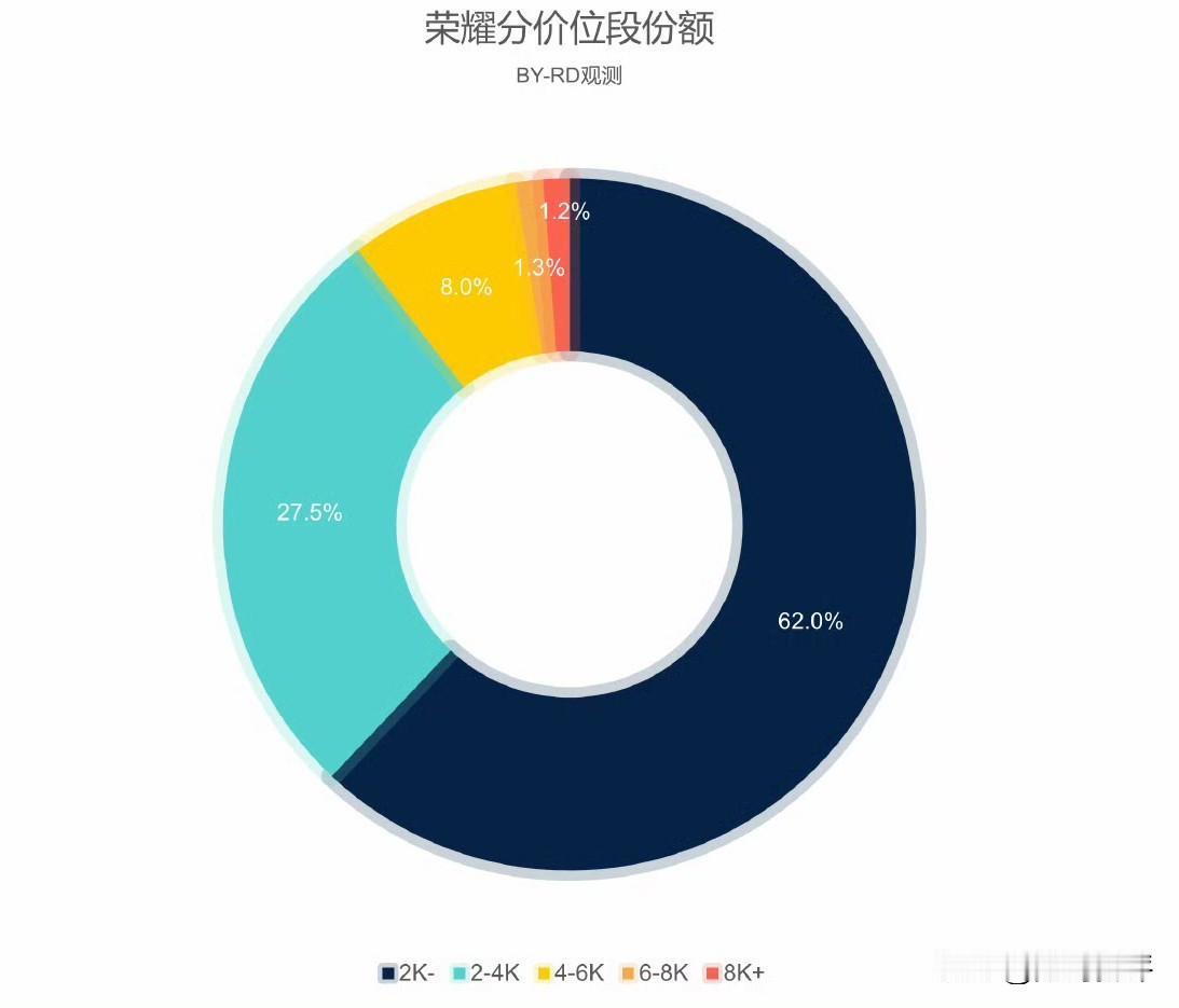 荣耀机型各价位段占比情况[思考]2K价位段占比60%,主要靠X系列,和数字标准版机型,2-4k价位段占比27%,4-6K高端机型占比8%,有一说一magic系列机型配置还不错,就是特色不明显,得有一提到magic机型就能想到一个特定,那可能销量就会好很多了[灵光一闪]