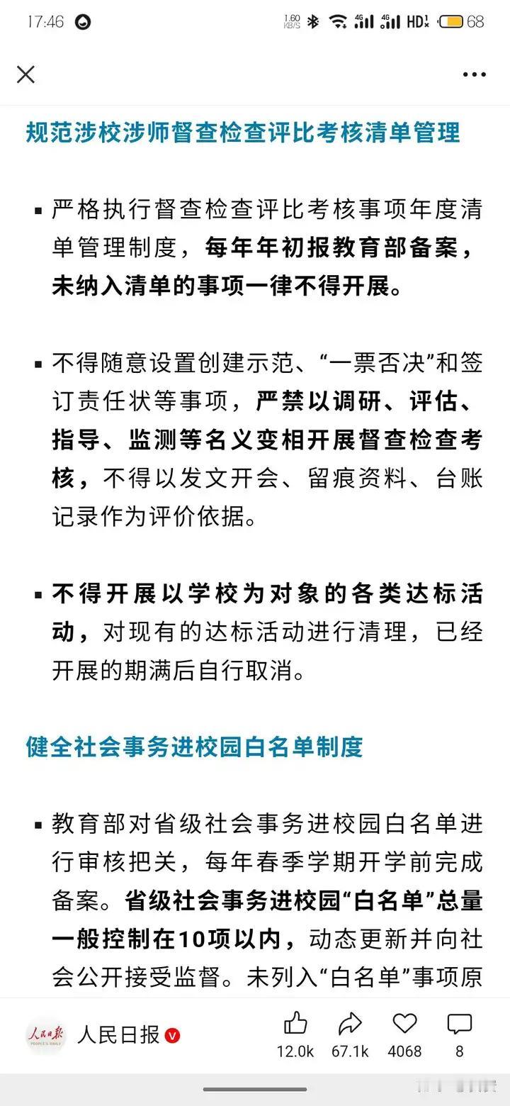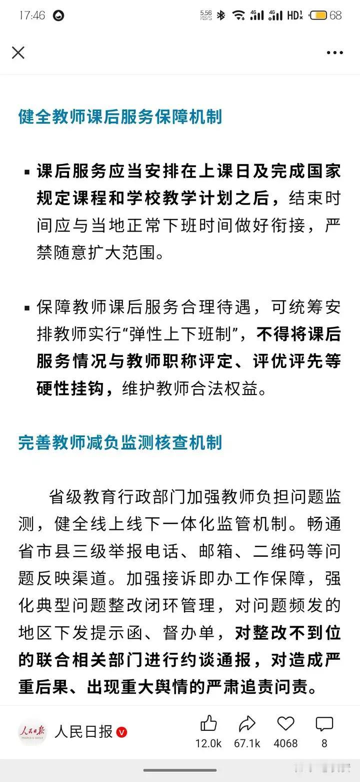 官方公布了中小学教师减负8条措施,终于有人考虑底层老师的真实感受了。 当老师的肯定都知道,最憋屈最难受的不是给学生上课,而是被迫放下粉笔,去做一堆跟教学八竿子打不着的杂事。 很多杂七杂八的工作动不动就让老师过去帮忙。这些老师都是被直接安排的,根本没得商量。结果大把时间都花在填表、写材料、搞这些表面功夫上了。 连扶贫的活儿也派到老师头上,还得挨家挨户去走访、了解情况。更让人想不通的是,春节明明学生都放假了,学校还安排老师轮流值班,学校里都没人了,也不知道到底值的是什么班。 我现在看到班级群里,班主任老师发各种码,消防知识宣传,禁毒知识宣传,等等一些无关紧要,无关教育的事情。我都替老师头疼,全是形式主义。 这些形式化的工作,说白了,对教学真的没什么帮助。 现在国家出了8项教师减负措施(具体的看下面图片),感觉现在教师终于可以好好的教书了。 这八条里,有几条真是说到点子上了!就拿“不准随便借老师”这条来说!现在好多单位一缺人,就盯上学校里的老师了。觉得老师有编制、听话、好使唤。结果呢?数学老师被拉去搞宣传,语文老师被调去整文件...... 这政策本身是好的,方向也对。但问题就出在执行上。咱们都知道,上头的政策传下来,就像一根绳子从上往下放,每经过一层就被松了一点劲儿。从国家到省里,再到市里、县里,最后传到学校,这一路下来,最初的那股劲儿还剩多少,真的很难讲。 说到底,给老师减负,就是给学生加油,给教育加分。希望老师可以回到讲台心无旁骛的教书育人。