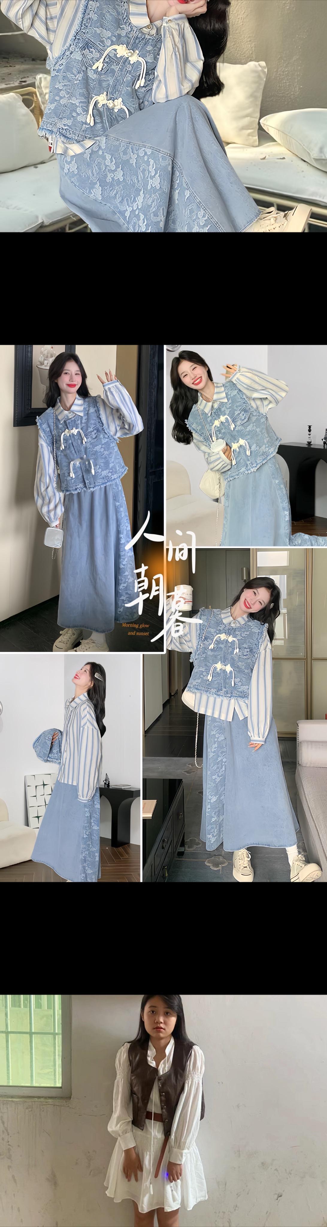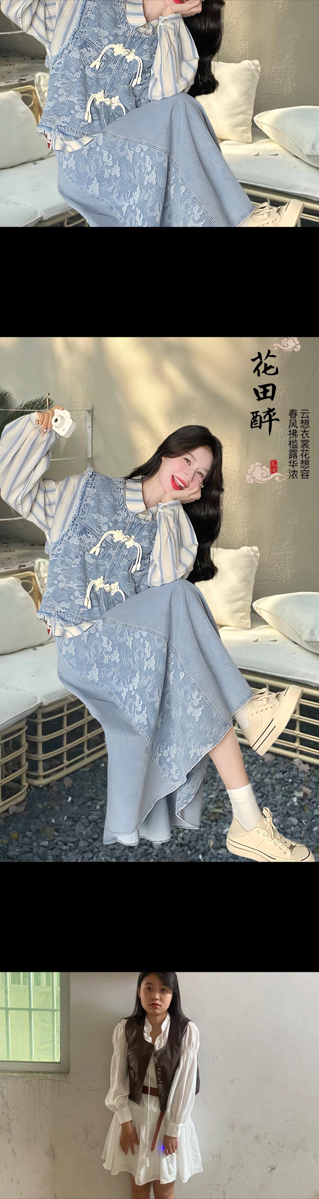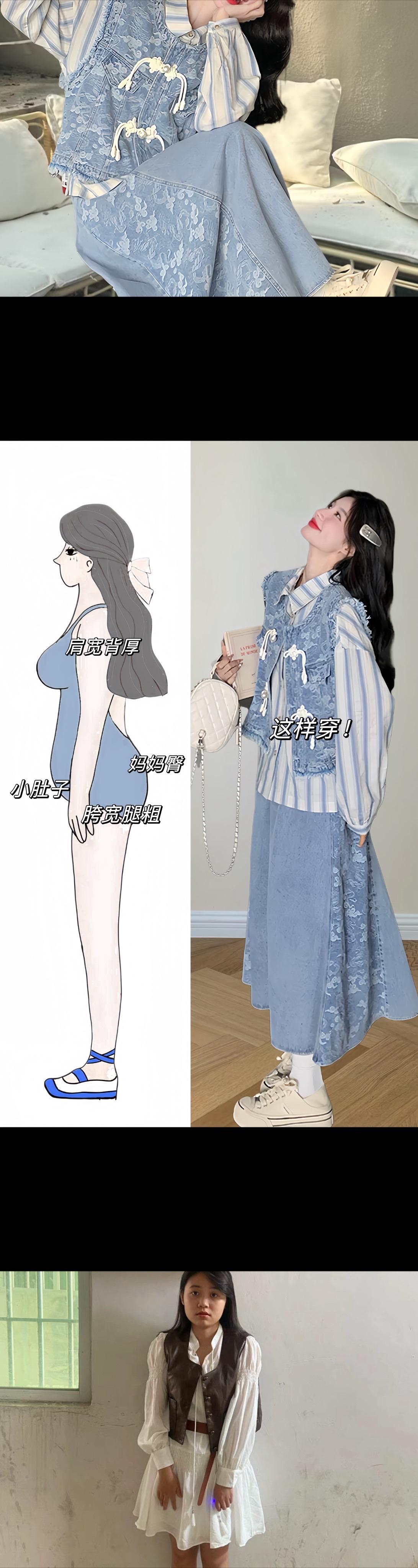 秋天穿新中式好美好温柔~忻州市提花牛仔马甲加时尚条纹衬衫加提花高腰半身裙三件套,温婉又气质,绝了,马甲独特的毛边处理,复古盘扣与现代工艺的巧妙融合,整体风格优雅不失活力,叠穿条纹衬衫又迎合了现代时尚潮流,搭配高腰半身裙,遮肚子,遮胯宽,一套上身遮肉显瘦,甜美减龄,精致有气质,高级感满满,版型不挑,身材微胖,梨形,小个子都能驾驭落落的。大方温柔贵气的穿搭,谁能不爱呢?秋日省心穿搭look 温柔风穿搭 新中式穿搭 遮肉显瘦减龄