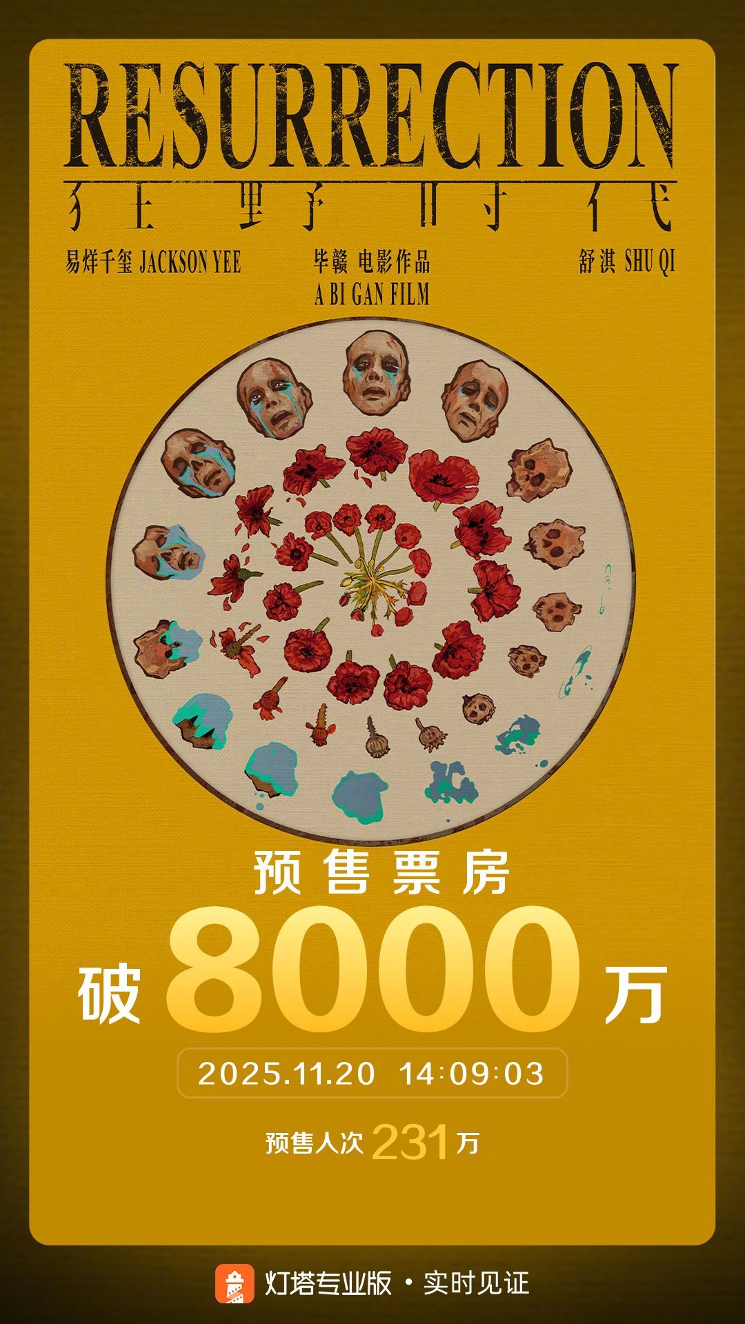 据灯塔专业版实时数据,截至11月20日14时9分,影片《狂野时代》预售总票房突破8000万。