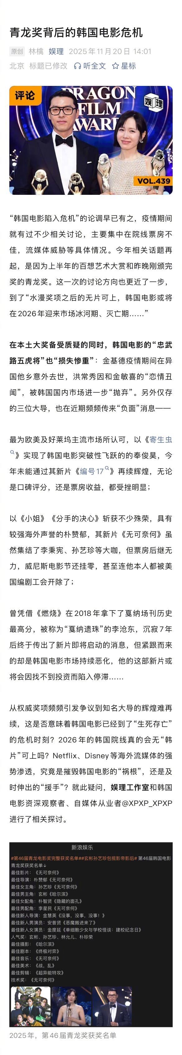 玄彬、孙艺珍双双拿下青龙奖影帝后,引发韩网争议。特别是在配合最佳男主角热门提名者李秉宪的不到场,最佳女主角提名者宋慧乔不走红毯的花絮来看,“预制奖项,预制话题,预制热闹”的嫌疑更加明显。尤为让人遗憾的是获得最佳男主角、最佳男配角双项提名的朴正民颗粒无收,连资深前辈文素利都要在台上打趣发言,疑似质疑…↓
