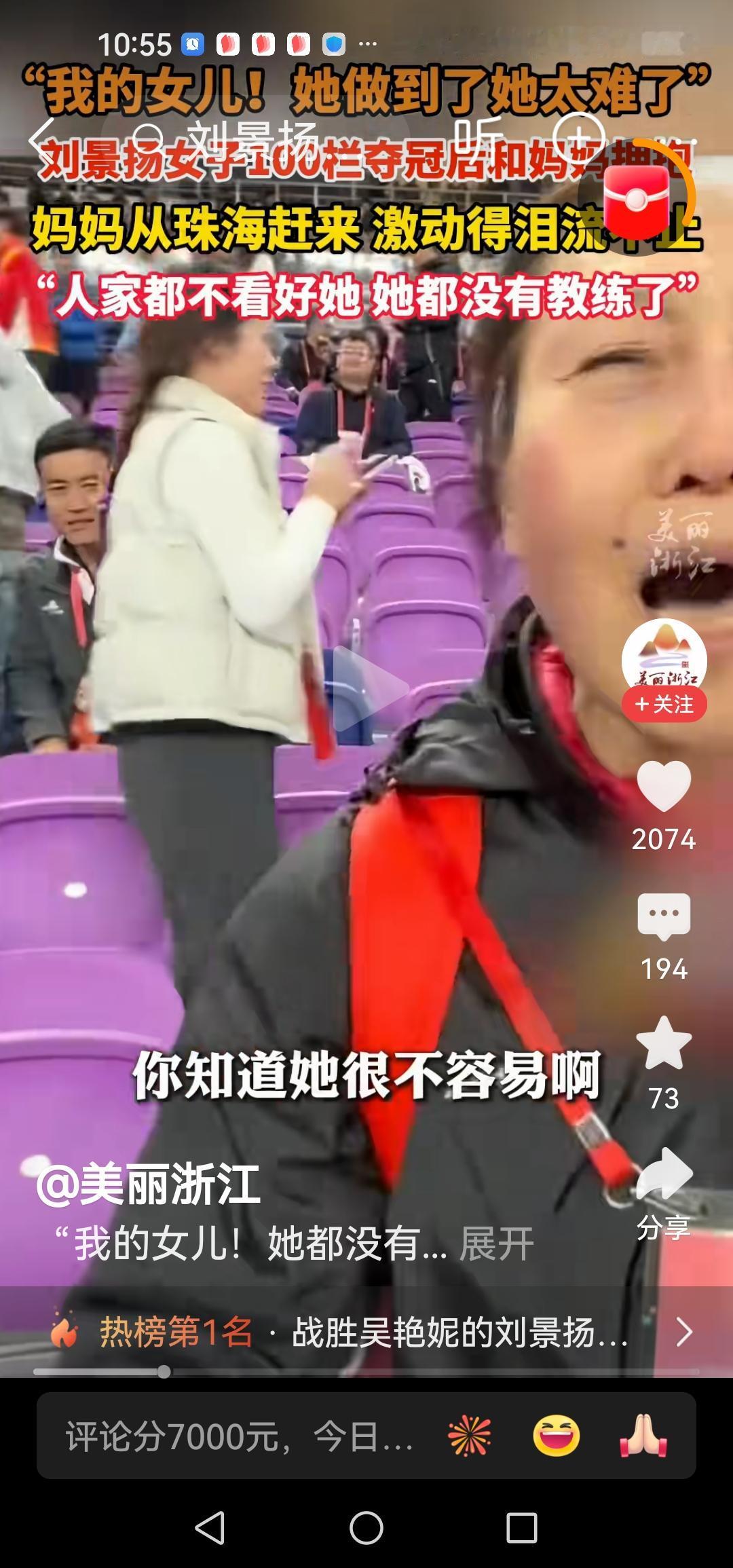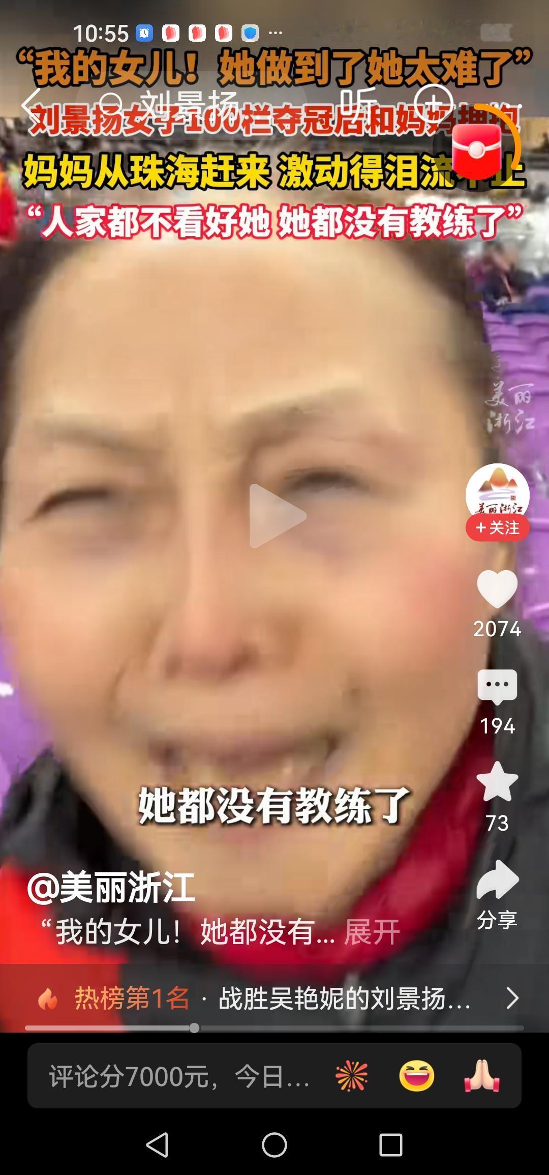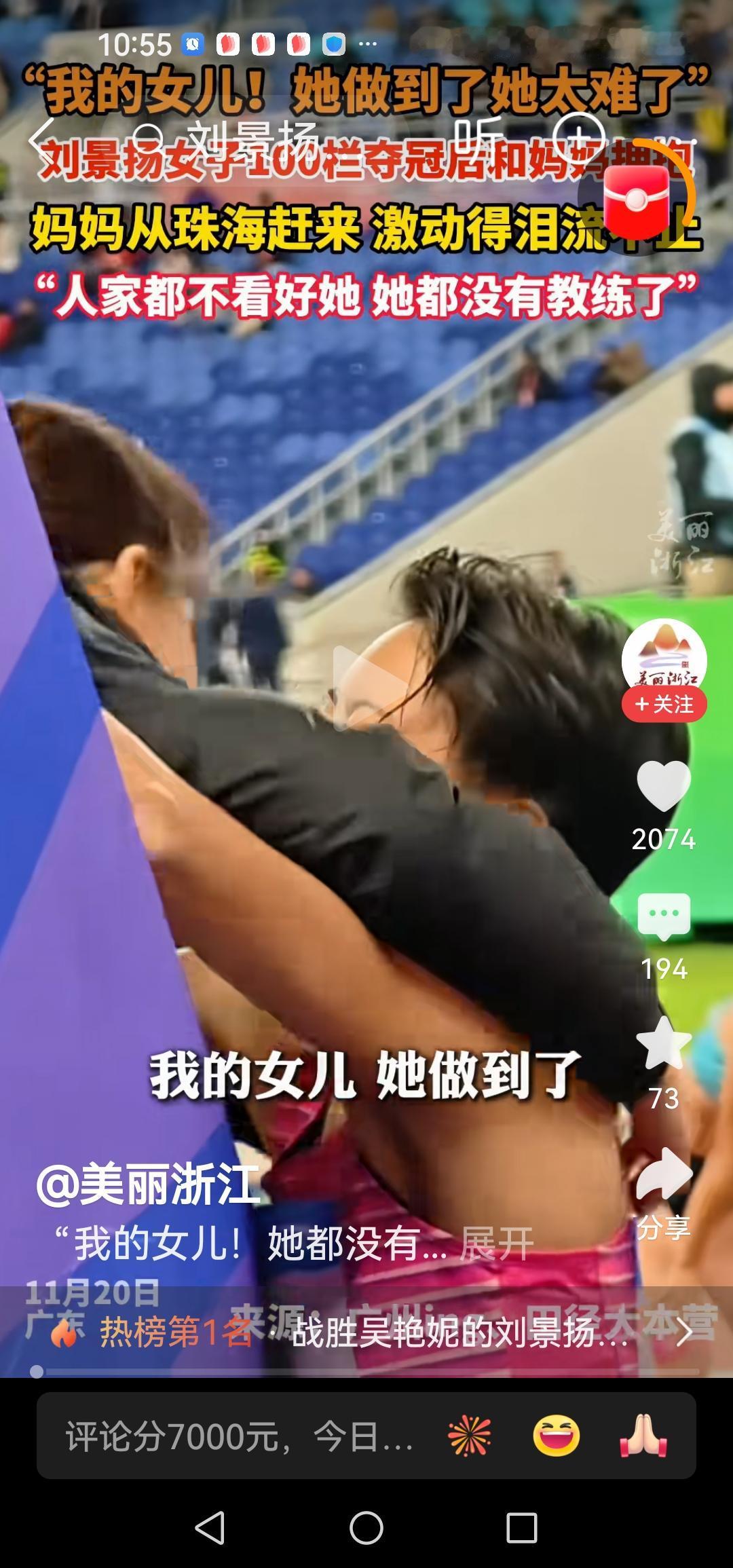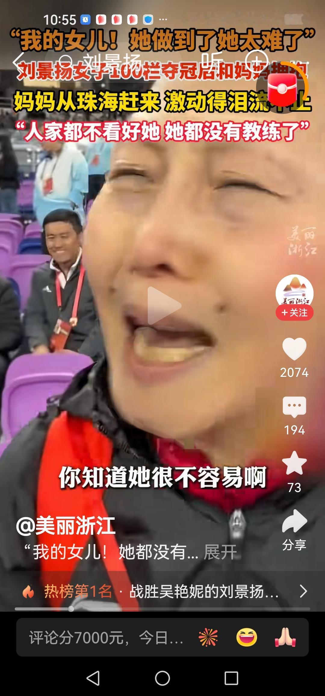 "我的女儿!她做到了她太难了"刘景扬女学工杨栏夺冠 一瞬间有一种想哭的感觉,妈妈说她太难了,夺冠后,这妈妈有多激动就有多心疼女儿,她都没教练呀,她很不容易啊。 突想那首青云志,无人抉我青云志,身处低谷不自弃,我命由我不由天。无人扶我青云志,我自踏雪至山巅。 有志者事竟成,这鸡汤我们都得热一热,得喝一口,给自己来点精神劲。