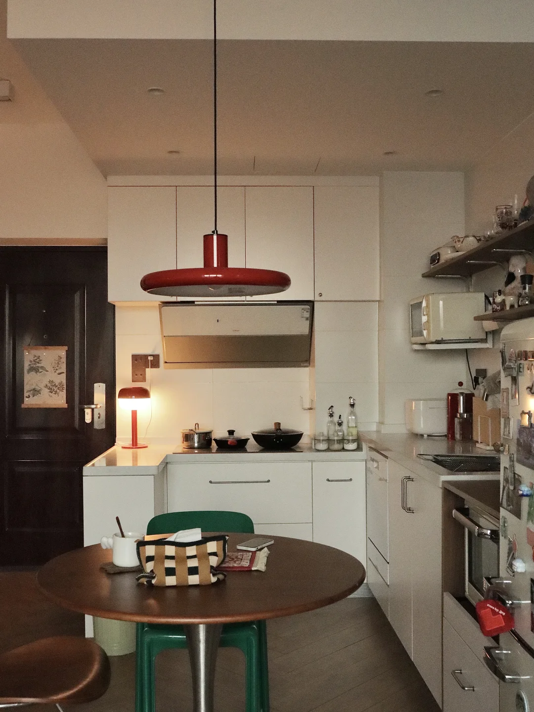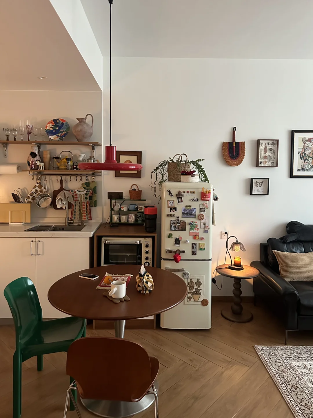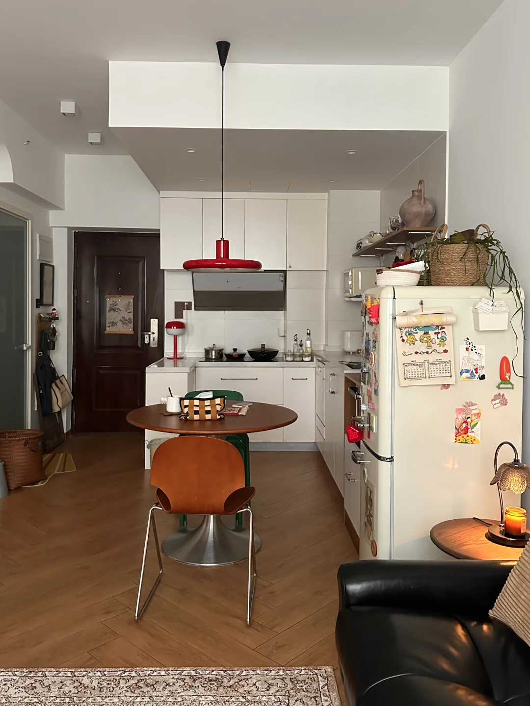 住在一个只有39平实用面积的房子里 很多空间设计考虑其实都围绕着两点: 一是空间开阔,住起来尽量舒服 所以我家没有顶天立地的柜体 也没有做厨房的隔断 能从客厅的一角无遮挡地眺望到另一角 视野开阔开阔了,空间也能显大 第二点就跟个人性格相关了 我很抗拒一成不变、一眼看到头的生活 所以我的家也得满足我的天性: 为了「新鲜感」,空间也要保留可变余地 ▪️除厨房做了定制柜外,全屋其余地方都是用的成品柜。万一以后不喜欢现在的风格和陈设,更换成本也不会高 ▪️全屋大白墙,没有涂有色乳胶漆 其中一个考虑就是为了更换墙面软装时,即使要不断更换钉子的位置,也更好补涂 ▪️客厅大面积留给了地毯和带轮子的茶几 要用时茶几是我的办公桌和小茶台,不用时把它推到一边,客厅就变成了我的休闲空间,方便我练舞、做瑜伽 …… 这些都不是标准化设计 只是刚好适合我 适合我这样的小户型空间 和我这样的人