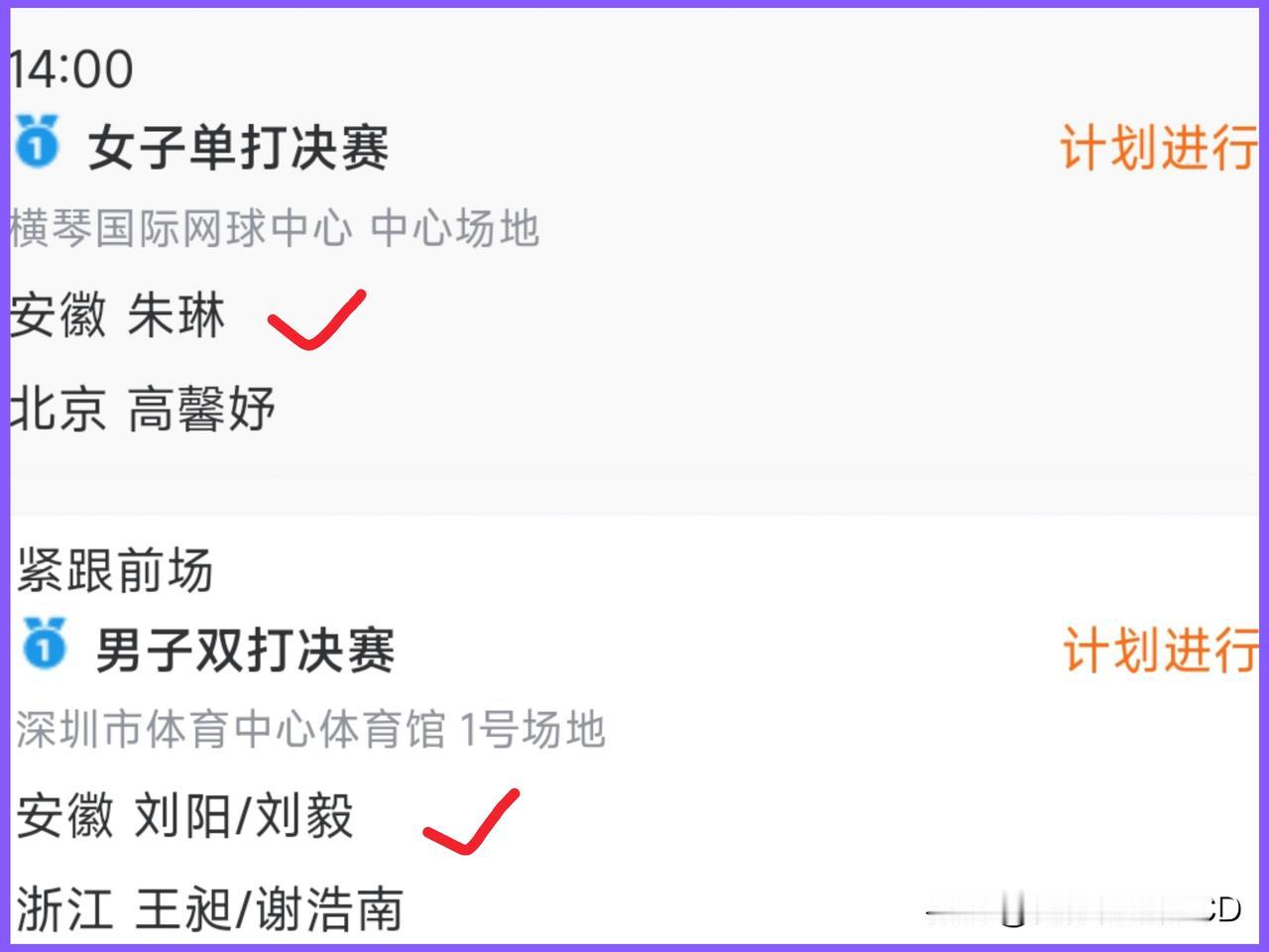 目前,安徽只获得5枚金牌! 下午,网球女单朱琳、羽毛球男双有希望添加金牌数。 🏅网球女子单打 朱琳 vs 高馨妤 地点:广东横琴国际网球中心 11月19日下午,女单半决赛,3号种子、安徽运动员朱琳2:0战胜1号种子王欣瑜(广东),晋级决赛,对手为高馨妤(北京)。 🏅羽毛球男子双打 刘阳/刘毅 vs 王昶/谢浩南 地点:深圳市体育中心体育馆 11月18日下午,男双半决赛,安徽组合刘阳/刘毅2:0战胜3号种子冯彦哲/刘雨辰(北京),闯进决赛,对手为2号种子王昶/谢浩南(浙江)。 安徽老乡,一起为安徽加油! 安徽身边事