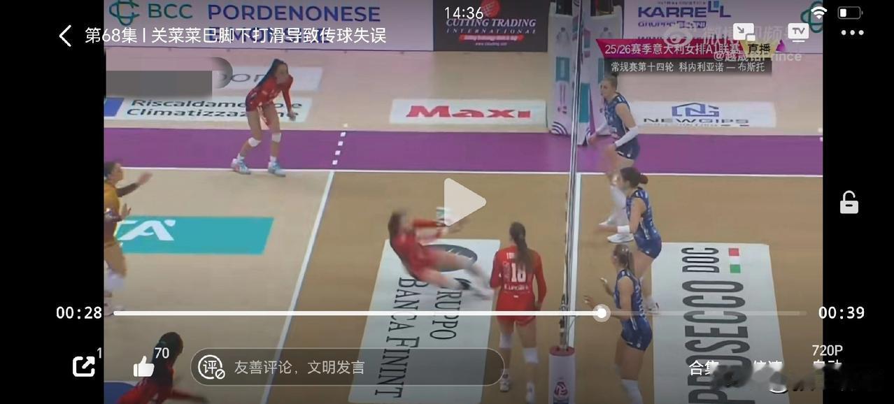 意甲女排提前赛第14轮科内vs布斯托,结果科内3-2险胜布斯托,比赛中,科内毕业生——关菜菜巳场上“溜冰”,导致传球失败。跑太快,脚下打滑,摔了个屁股墩,看起来有点好笑。