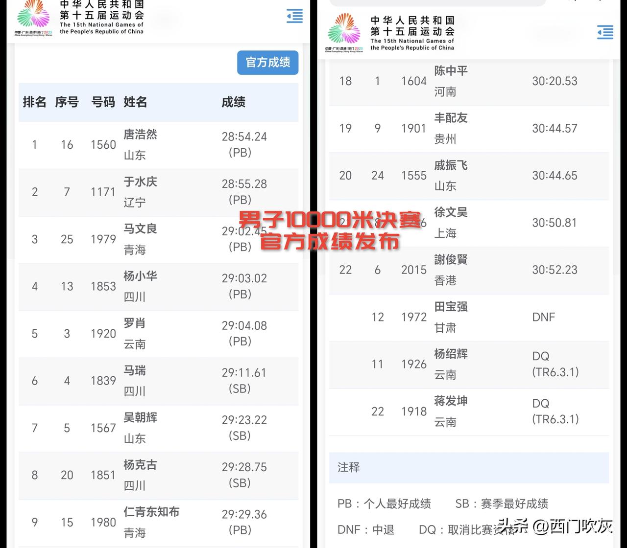 【云南两运动员成绩取消,山东辽宁青海分获男子10000米金银铜牌!】 稍前发布的半日战报10000米金银铜牌分属云南、山东和辽宁,但比赛结束后官方迟迟未正式发布奖牌榜。 事后得知:男子10000米决赛出现了争议一幕,云南队利用团队优势帮助蒋发坤率先完成了比赛,结果因为违规而被取消了成绩。 山东、辽宁和青海获得了最终的男子10000米金银铜牌。