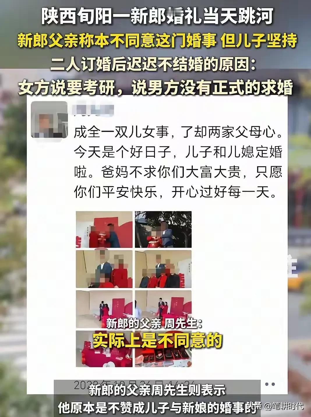 10月21日报道,新郎29岁在婚礼当天跳桥,七天后打捞上来,西装领带泡得发白,让人心痛![黑线] 婚礼当天,陕西旬阳一位29岁的新郎从洵河大桥跳入河中,七天后,救援人员在下游找到他的遗体,定制西装上绣的名字还清晰可辨,但整个人生已经随着河水远去。 新郎突然从酒店跑出,直奔大桥,这个本该接受祝福的时刻,成了悲剧的起点。 原计划2025年10月结婚,但婚期却一再推迟,根据新郎父亲的说法,女方先后提出三个理由,需要时间减肥以便拍婚纱照,准备考研担心受影响,以及新郎没有正式求婚。 每次变更婚期,都让两个家庭的关系更加紧张,新郎父母曾对这段感情有所顾虑,觉得女方在婚事上比较坚持己见,很少商量,但因为儿子喜欢,他们最终还是选择了支持。 婚礼前一天,新郎去女方家布置新房,回来后情绪明显低落,知情人士透露,当时双方因一些琐事发生了争执,但具体细节家人不愿多谈。 新郎堂伯表示,两家已达成协议,女方退还了18.8万元彩礼和“六金”,男方家庭决定不再追究,准备让新郎入土为安。 从校园恋情走到婚姻,本是美好的缘分,但婚期一再推迟,迟迟不愿领证,这些信号或许早就提示着关系存在问题。 当两个人明显不适合,选择分开反而是对彼此的尊重,婚姻不能只靠单方面的努力维系,没有任何困难值得用生命去解决,每个生命都珍贵,都有重新开始的机会。 身体发肤受之父母,多为父母想想。 “太心疼了,才29岁,人生才刚刚开始啊,有什么坎是过不去的呢,这样一走,最痛苦的还是生养自己的父母。” “看到‘西装泡得发白’这个细节,瞬间破防了,能想象他当时是怀着多么绝望的心情,才做出了这个决定,无论原因是什么,这个结局都太令人心碎了。” “这个事儿,我看女方的态度确实有问题,一会儿要减肥一会儿要考研,说白了就是‘不够爱’,或者还没准备好,男方陷得太深,投入了太多沉没成本,最后钻了牛角尖。” “‘握不住的沙,不如扬了它’,这话虽然残酷,但有道理,感情是两个人的事,单方面的坚持和妥协,就算勉强结了婚,未来也未必幸福。” “我们现在都是旁观者,具体两人之间发生了什么,外人很难完全清楚。但无论如何,沟通肯定是出了问题。” 从这个令人心碎的事件中,你认为最重要的教训是什么?是应该学会在感情中及时止损,还是更应该关注自己与身边人的心理健康,学会在压力下寻求帮助? 信源:网易