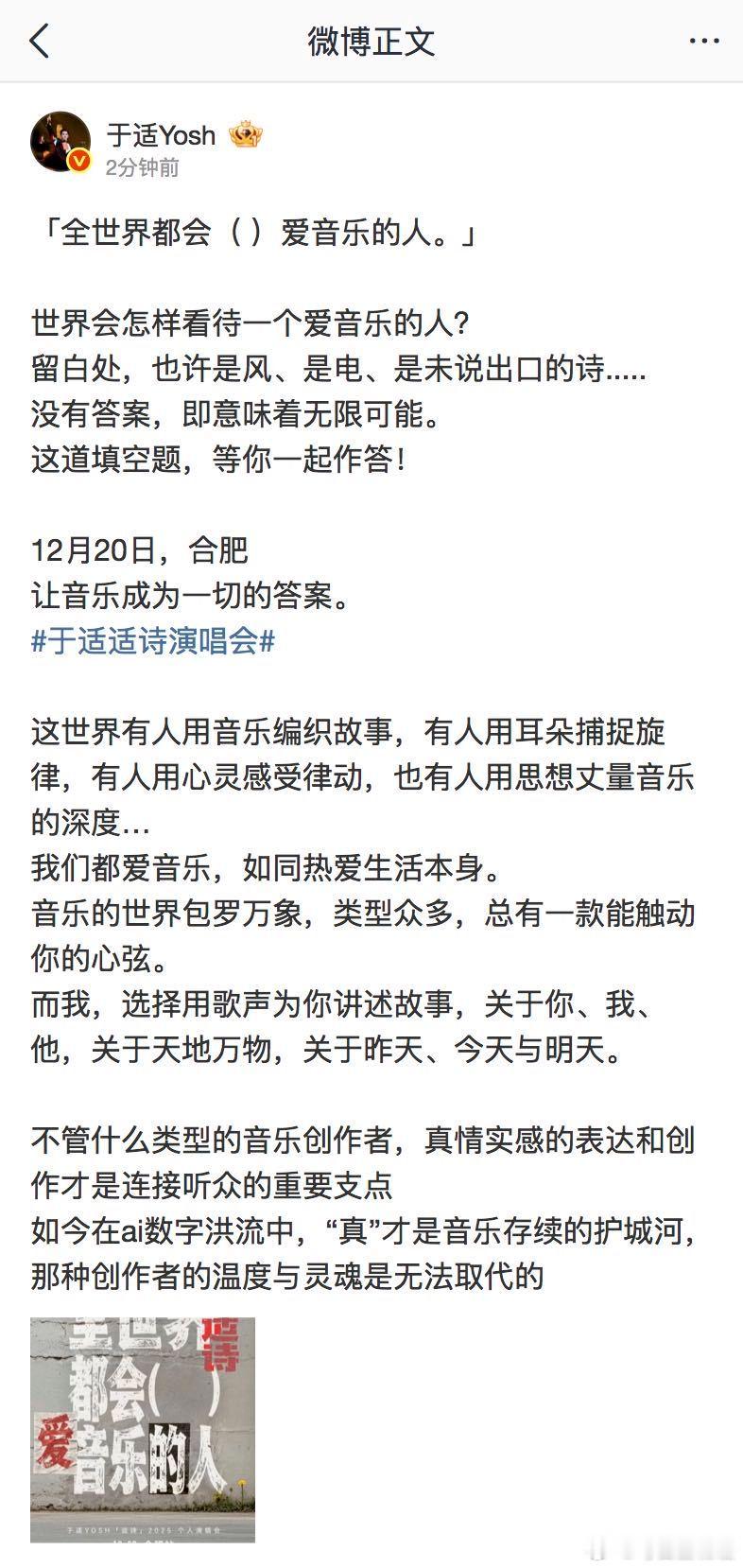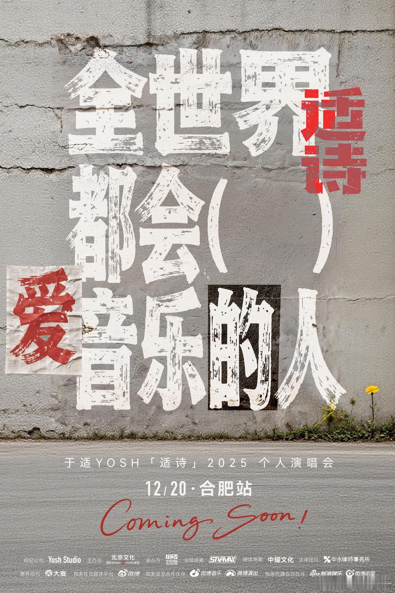 多栖艺人于适带着他的首次个人演唱会来了!时间12/20,坐标合肥,主题「适诗」,从大银幕的演员到自由创作歌者,于适不仅跨界演绎角色,也在音乐表达上完成了自我蜕变,生日前夕首次个唱真的期待值拉满,全世界都会( )爱音乐的人,必须(支持)~搓搓手等预售吧!