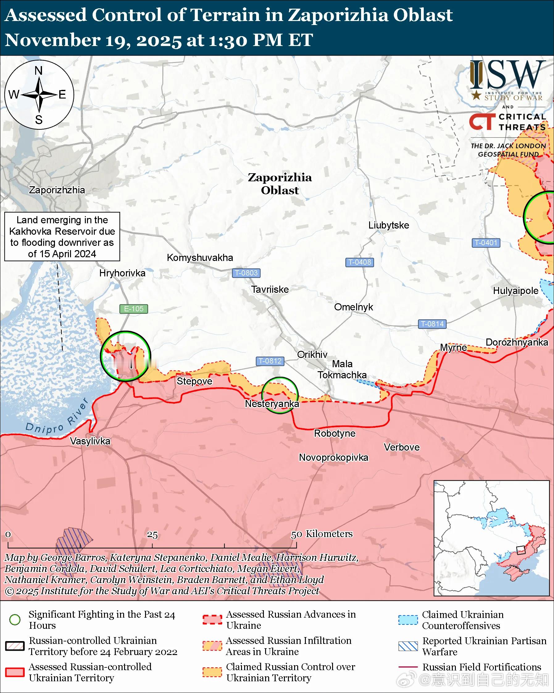 南方轴心俄军目标:守住前线阵地,确保后方免受乌克兰军队袭击,并推进至扎波罗热市的管式火炮射程之内。11月19日俄军继续向胡利亚波列方向发起进攻。评估俄军的进展:11 月 14 日发布的地理定位视频显示,俄军向普里维利亚(胡利亚波列东北部)的西部和西南方向推进。俄军击了胡利亚波尔以北的叶霍里夫卡、里夫诺皮利亚和亚布卢科夫附近,并向多布罗皮利亚进发; Hulyaipole 东北部,靠近 Solodke、Zlahoda、Pryvilne、Krasnohirske、Rybne 和 Pavlivka;在 Hulyaipole 以东靠近 Malynivka、Zelenyi Hai、Vesele 和 Zatyshshya 的地方。一位俄罗斯军事博主声称,乌克兰军队在马利尼夫卡和亚布卢科夫附近以及从拉迪斯内和新扎波罗热(均位于呼利亚波勒以北)发起反击。乌克兰扎波罗热州军事管理局局长伊万·费多罗夫于 11 月 18 日报告称,俄军对沃兹德维日夫卡(胡利亚伊波列西北部)进行了滑翔炸弹袭击,造成两名平民受伤。作战序列:据报道俄第127摩步师(隶属第5集团军,东部军区)正向多布罗皮利亚和瓦尔瓦里夫卡(胡利亚伊波列以北)方向推进。第127摩步师第114摩步团继续向胡利亚伊波列方向推进。俄罗斯总参谋部情报总局(格鲁乌)第14特种旅的无人机操作员继续向胡利亚伊波列方向推进。11月19日俄军继续在扎波罗热州西部发动进攻,但并未取得进展。俄军于 11 月 18 日至 19 日袭击了 Mala Tokmachka 附近的奥里希夫东南部、涅斯捷尔扬卡以北地区的奥里希夫西南部以及谢尔巴基、斯特波韦、诺沃安德里夫卡、普里莫尔斯克、卡缅斯克和斯特普诺希尔斯克附近的奥里希夫以西。11 月 19 日发布的地理定位视频显示,乌克兰军队对位于多林卡南部(奥里希夫西南,俄罗斯近后方)的据称是俄军指挥所和无人机控制点进行了打击。作战序列:据报道俄第291摩步团(第42摩步师,第58集团军,南部军区)第3突击连“涅梅茨”大队的FPV无人机操作员和突击队员,以及第392摩步团(第19摩步师,第58集团军)第1库班营“福比亚”分遣队的无人机操作员,正在扎波罗热州作战。11月18日和19日,俄军继续在赫尔松市以东的安东尼夫斯基公路桥附近进行有限的地面进攻,但并未取得进展。11 月 17 日一位俄罗斯军事博主发布了一段视频,视频中俄军在赫尔松市使用 FPV 无人机袭击了一辆民用汽车,并声称俄军会将任何民用车辆视为合法的军事目标。作战序列:据报道俄第70摩步师(第18集团军,SMD)的“福布斯”无人机大队的无人机操作员继续在赫尔松州作战。第98空降师(VDV)在卡霍夫卡(赫尔松市东北部)附近作战。