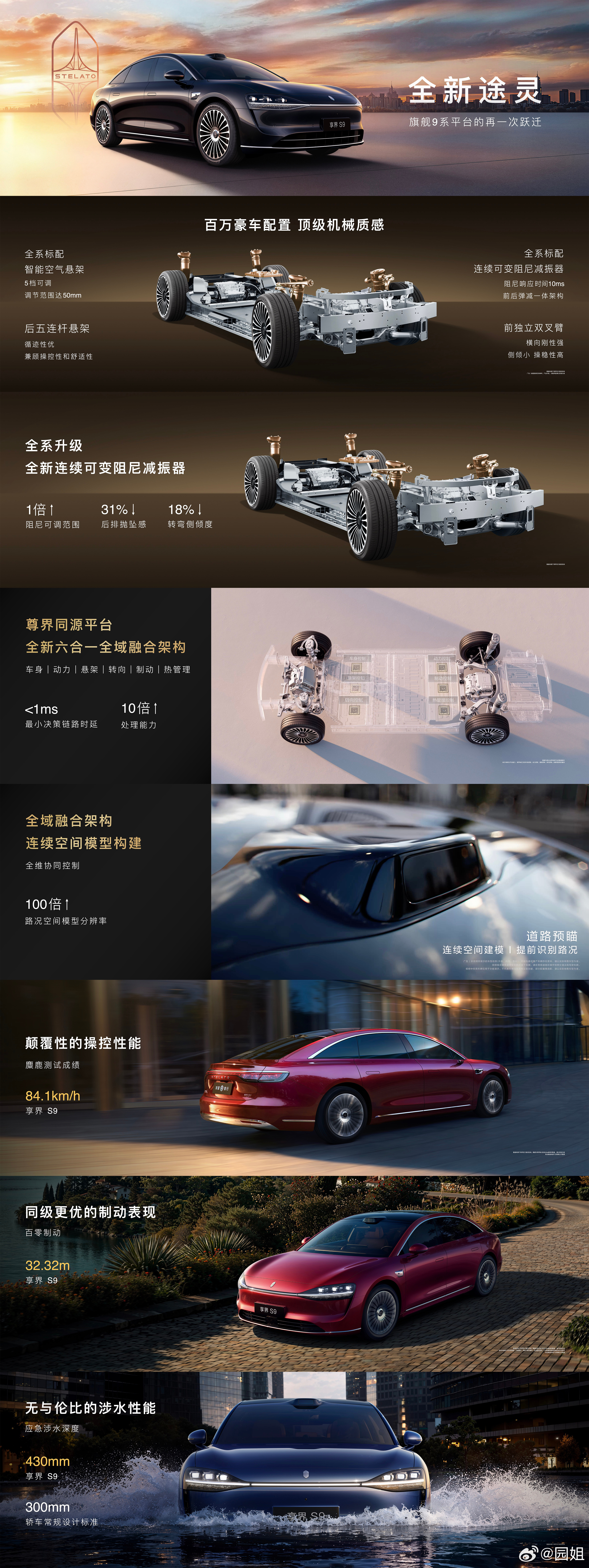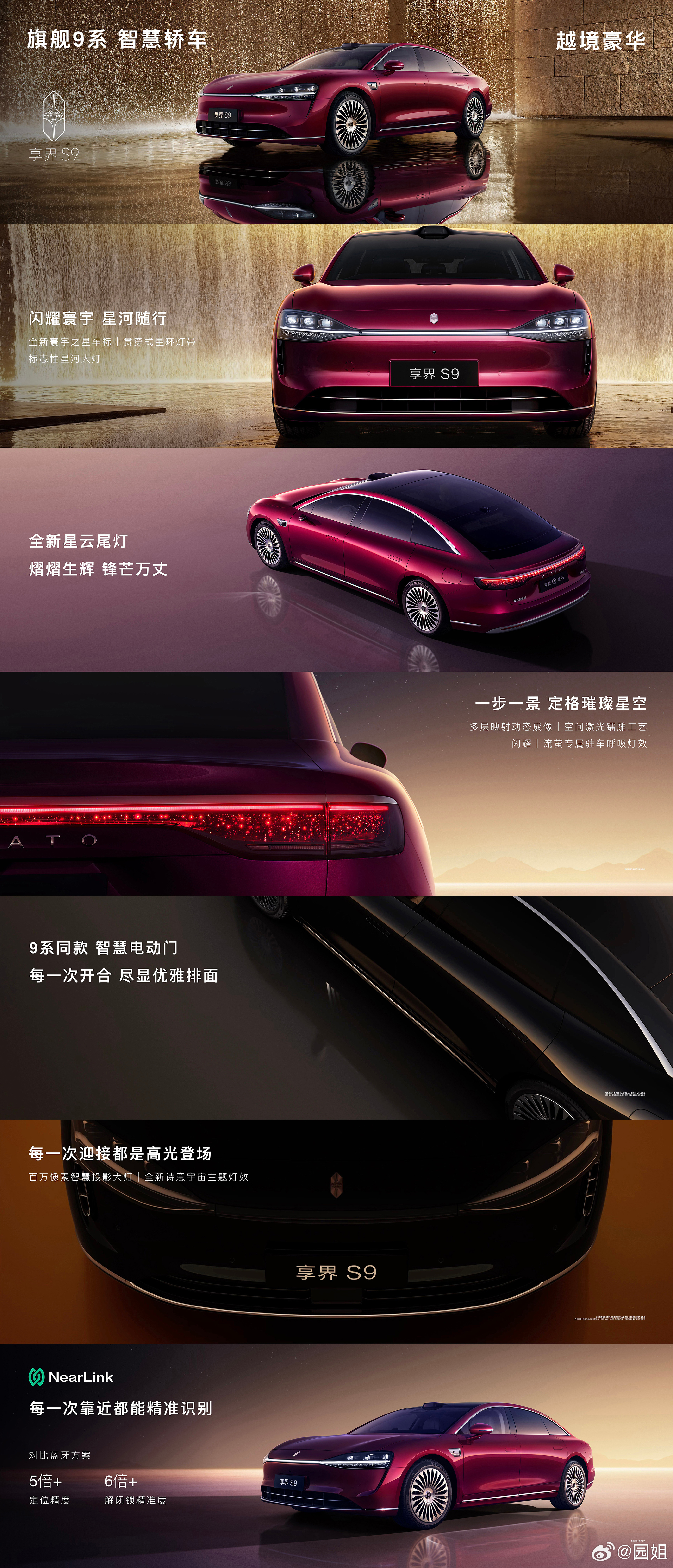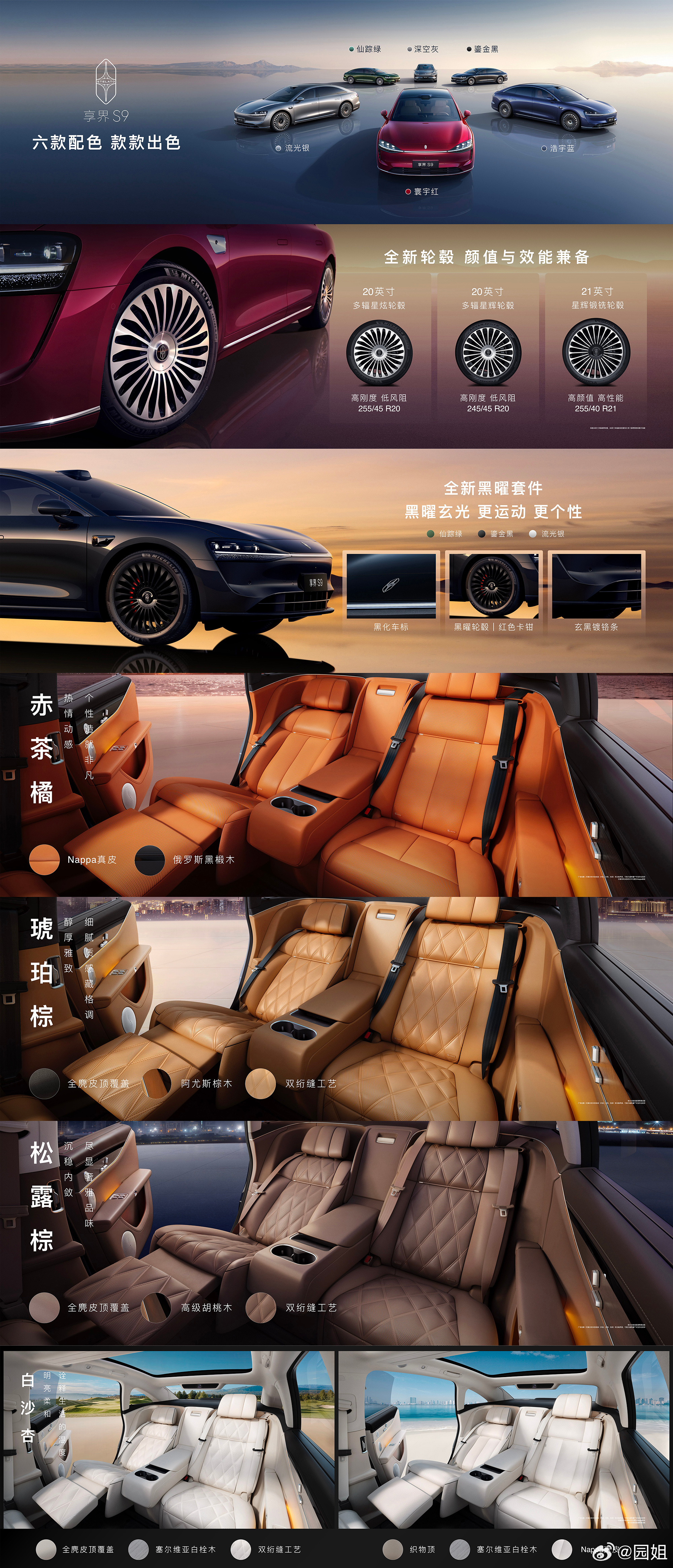 新款享界S9全新演绎寰宇美学,搭载全新寰宇之星车标、标志性星河大灯、全新星云尾灯、智慧电动门,华为百万像素智慧投影大灯,升级小狗趴下等多种灯效,营造专属仪式感;此外,支持隔空召唤、语音控车;新车有流光银、仙踪绿等共6款寰宇色系,赤茶橘、白沙杏等4种内饰颜色以供选择,提供20英寸多辐星炫轮毂等多种轮毂,另有全新黑曜套件可选,满足用户的多样需求。 新款享界S9座舱科技体验全面升级,搭载16.1英寸全新中控屏、12.3英寸副驾屏、智能投影巨幕系统2.0、全新MagLink Mini控制屏等超十屏智能座舱;标配华为悦彰音响卓越系列,采用25单元声学设计,随享流动音乐厅,支持无麦K歌,随时欢唱。此外,新车搭载鸿蒙ALPS健康座舱,采用创新可吸附降解材料,24⼩时智能新风⾃动净化空⽓,并通过中汽中心的自主智能净化座舱测试,烟颗粒物净化、整车雾霾阻隔、霉菌培养对比表现皆优异,让驾乘者安享健康舒适。
