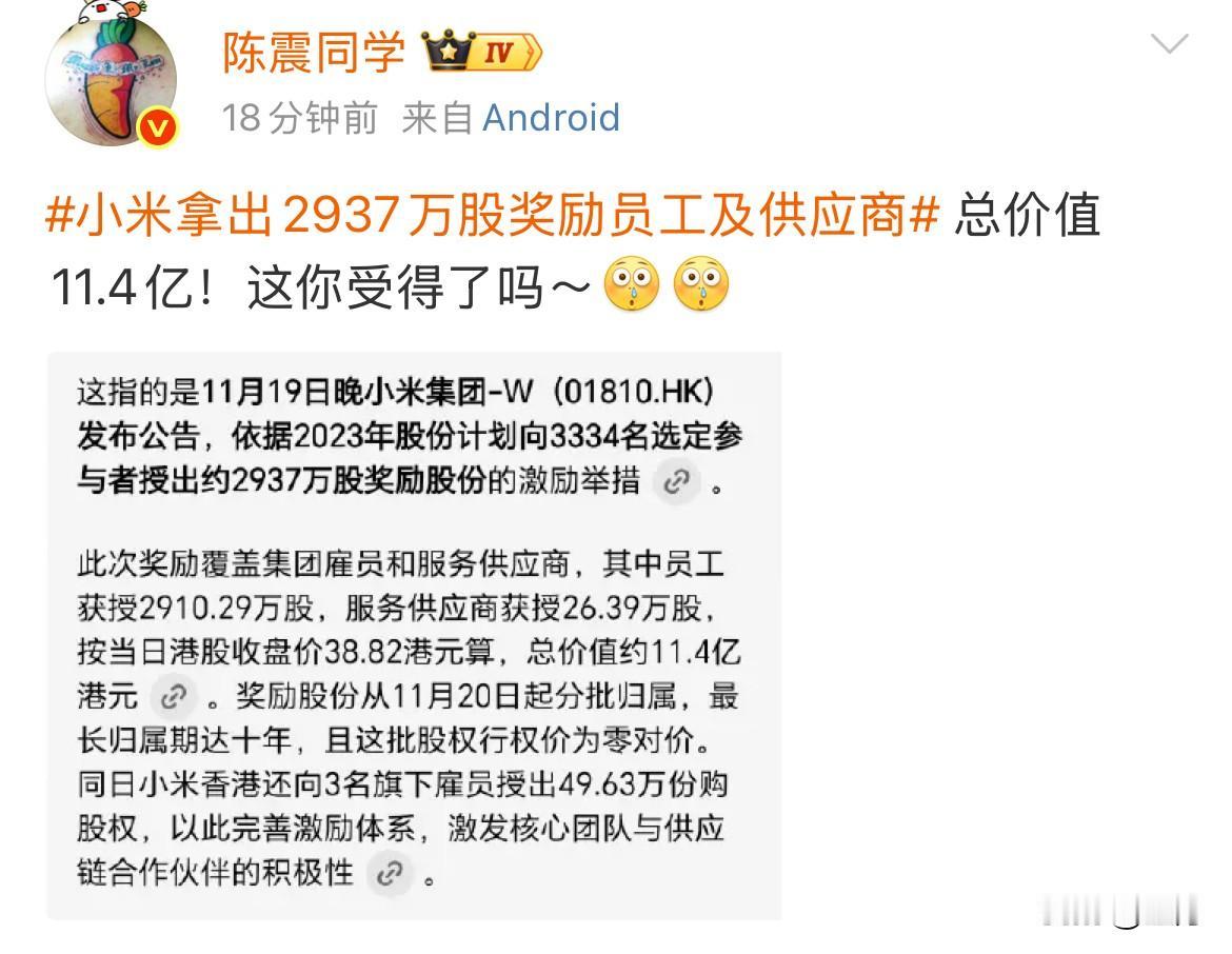 陈震: 小米拿出2937万股奖励员工及供应商,总价值11.4亿!这你受得了吗[捂脸] 就在刚才,陈震在社交网络晒出了这条消息,首先让大家看到不一样的就是这个数字,11.4亿的股份拿出来奖励给员工,甚至还有供应商! 一般的厂家,把股份或者钱,拿出来奖励给员工或者管理层可以理解,但是还很少有厂家直接把自己的股份拿出来,给供应商奖励,那也就从盟主意义上来说,从某种意义上来说,小米这样做就是承认了供应商的重要性! 毕竟有福同享,他不是靠嘴巴说说而已,而是真的赚到了钱之后,给自己的家人分的同时,还给自己的伙伴分享,这份胸怀与格局,可以说在同行里面并不多见。 而且按照正常逻辑来说,他们一般都是年底的时候才这样干,小米提前把这个事情一个多月去干了,那是不是意味着,年底的时候还要再分一次[捂脸]