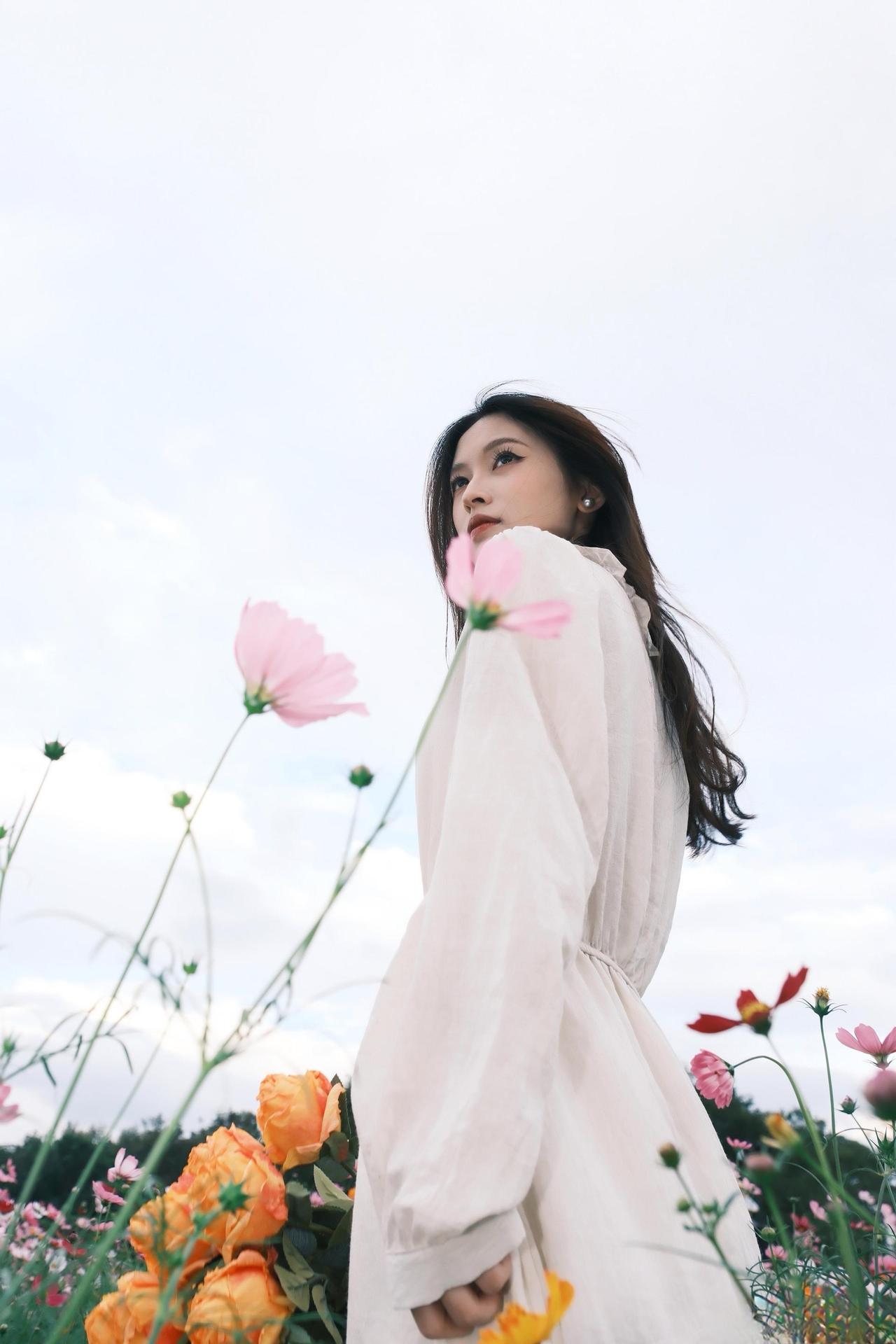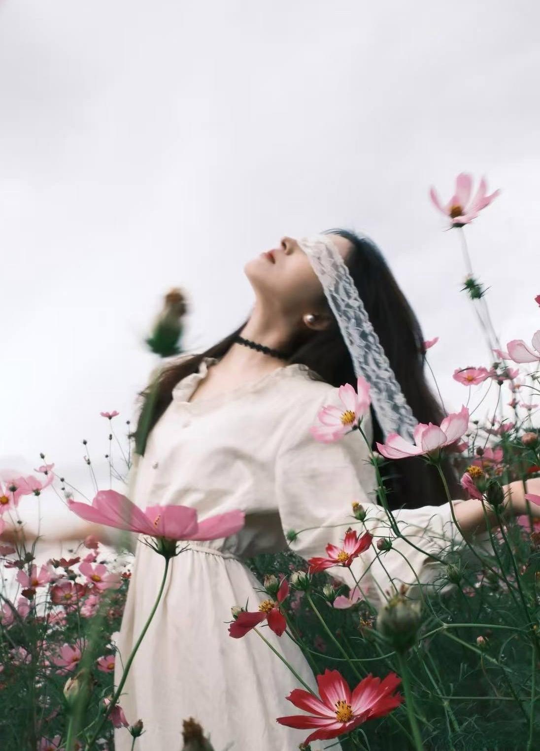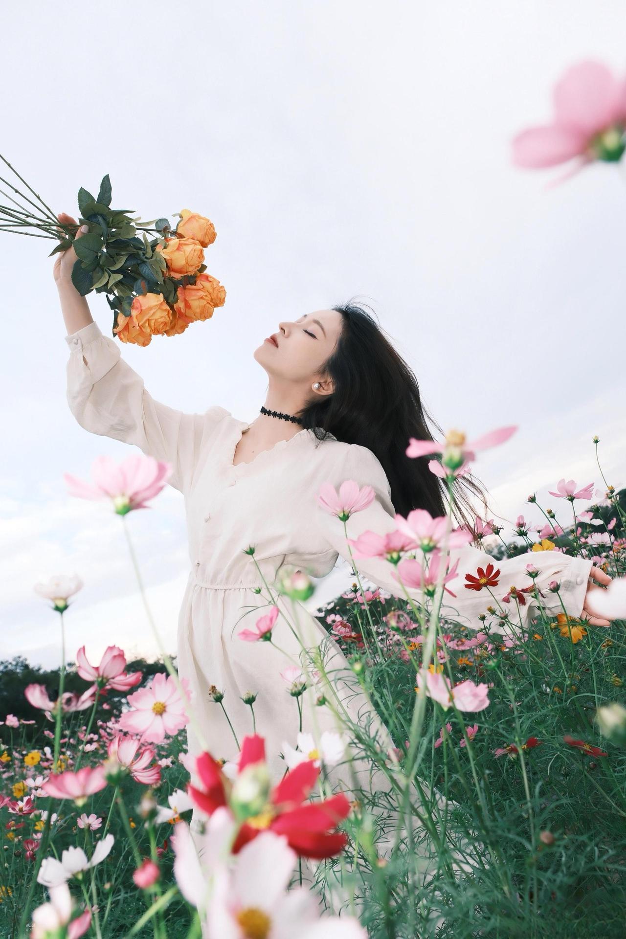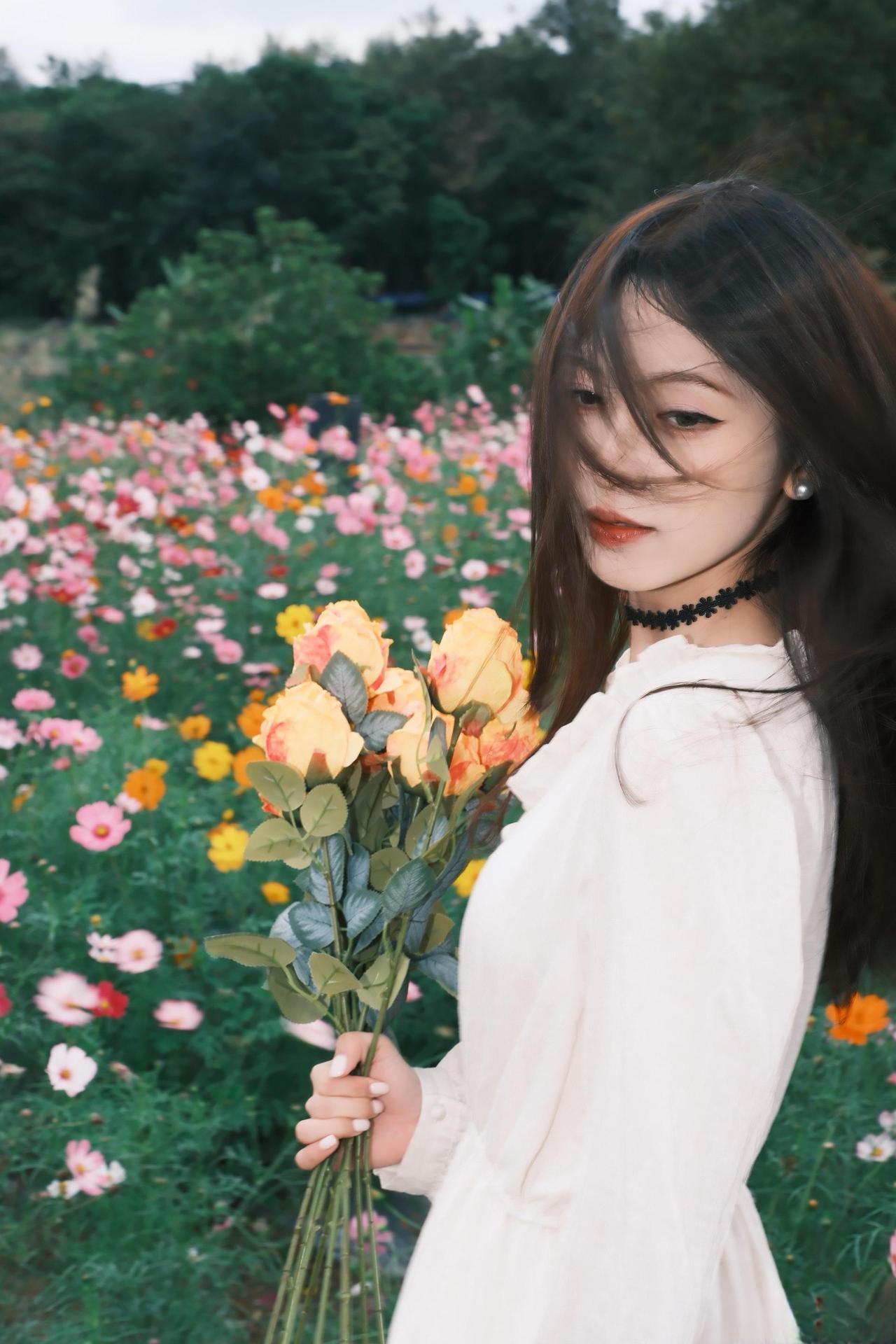 花海中的少女,手捧一束玫瑰,温柔而浪漫。