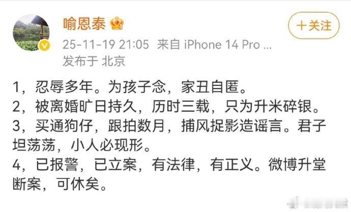 近日,因疑似与喻恩泰出轨引发热议的张敏进律师接受潮新闻采访,称网上传言不实,均为诽谤,目前已正式向公安机关报案。她还表示该事件是营销号团队精心策划,背后可能涉嫌非法获取公民个人信息及敲诈勒索等涉黑涉恶行为。表示自己与喻恩泰在酒店见面是因代理离婚案需保护隐私,网传被拍视频内容属断章取义。愈演愈烈,这两天双方都是一天一个料,互相指责对方出轨昨晚,喻恩泰称自己为了孩子忍辱多年,“被离婚”了三年,网传他出轨的报道是对方买通狗仔,跟拍数月造的谣,表示自己已经报警立案了。