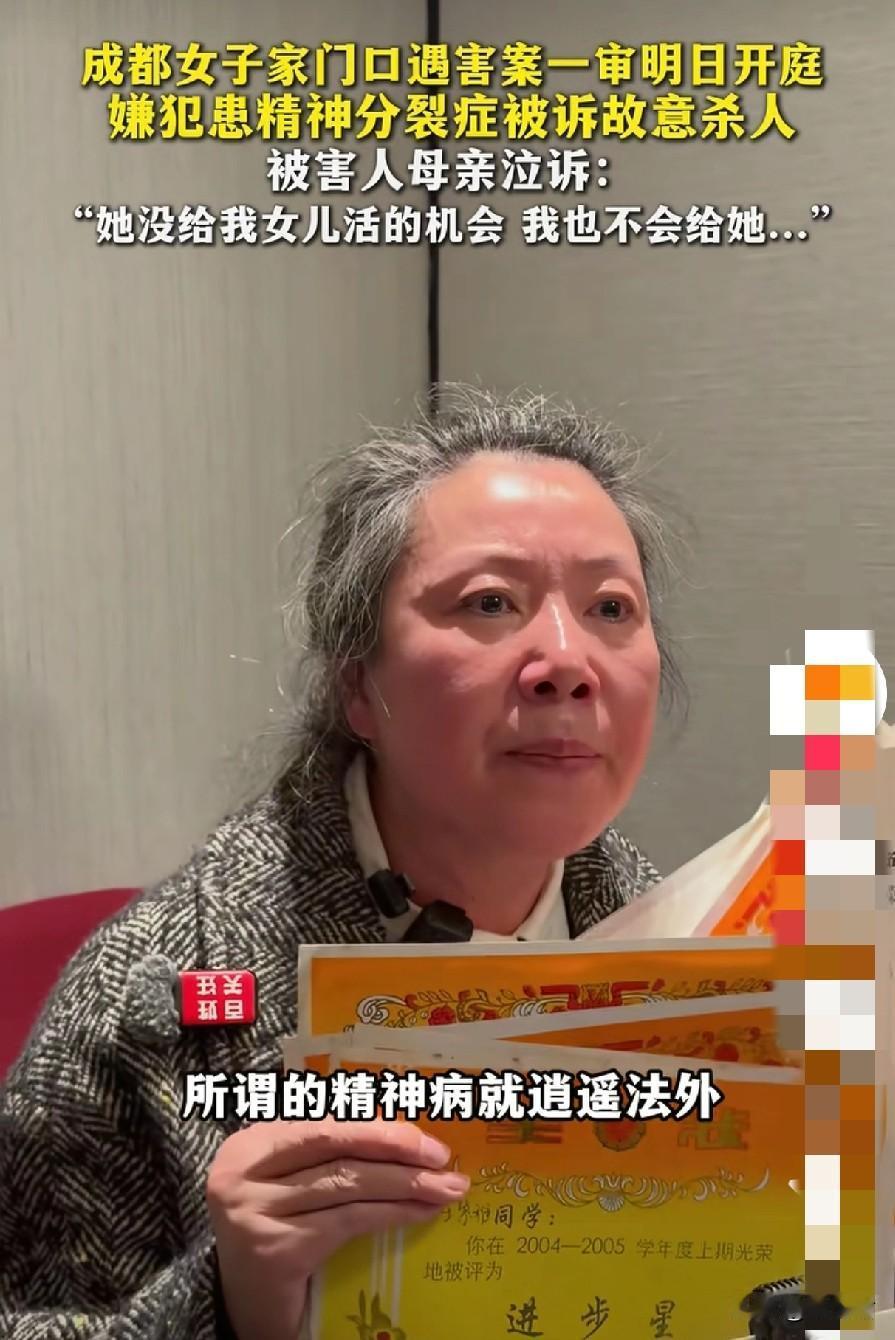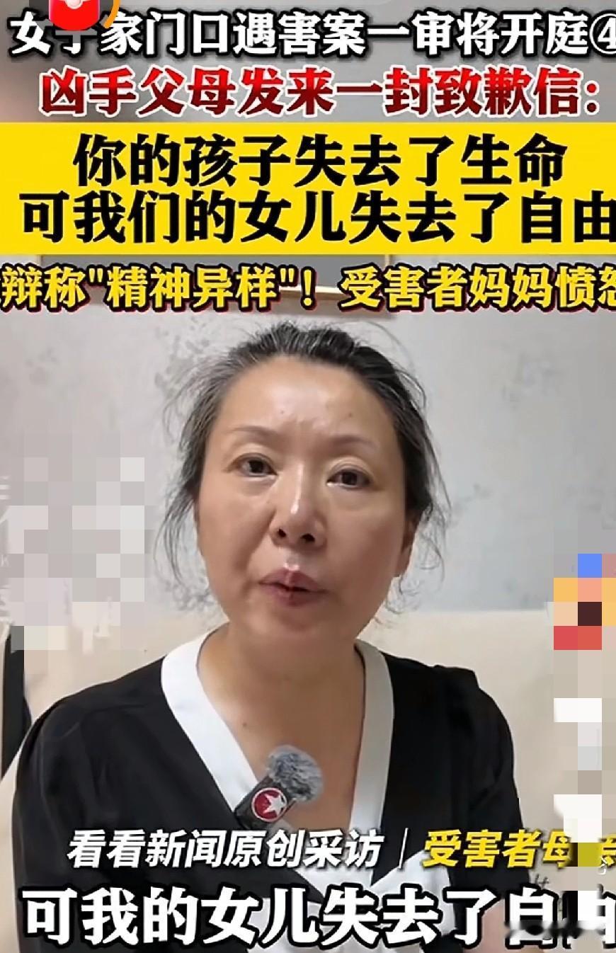 真是杀人又诛心啊。精神病患者伤害了一个女孩,她的母亲开庭前却发来一封给受害者母亲的“道歉信”。 信上那句,“你的孩子只是失去了生命,我的女儿却失去了自由”。这句话熟悉不熟悉,像不像“一帘幽梦”里渣男的楚帘说过的一句话,“你只是失去了一条腿,可紫菱失去了她的爱情”。 怎么有这么恶心的对白,生命和自由比起来,谁可贵,精神病患者能不能成为免死金牌? 一个无辜地生命,就这么葬送在家门口,换谁也接受不了,女儿就倒在家的位置。再遇到陌生人跟在外面,直接报警处理,不要开门,等警察来处理,而不是打电话给保安,以为安全了,门一开,悲剧了。 这位受害者的母亲,需要的是公平公正的对待,面对凶手母亲的所谓“道歉信”,她不接受。大家支持,精神病患者犯法和普通人一视同仁吗? (图片来自网络视频)