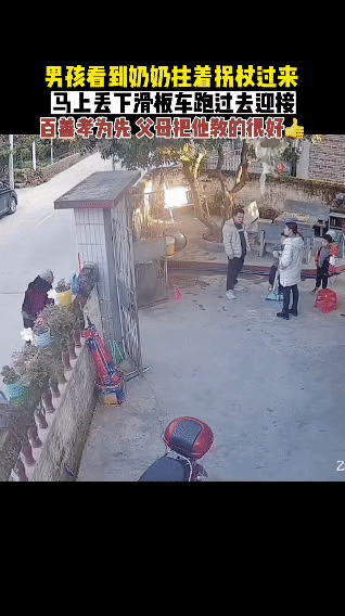 刷到这个视频的时候,心里像被轻轻捂热了一块,都说百善孝为先,孩子的教养就是父母最大的脸面,此刻,在这孩子身上完美体现。 院子里,小男孩正摆弄着手里的滑板车,眼角余光瞥见奶奶慢慢走进来,立刻“啪”地把车子往旁边一放,小碎步就奔了过去,伸手牢牢扶住奶奶的胳膊,仰着笑脸脆生生喊:“奶奶您来了,您小心点。” 他还小心地帮奶奶拍了拍衣角上沾的细灰,又搀着奶奶往院子里走。 站在一旁的父母看着这一幕,嘴角的笑都没落下过,眼里全是藏不住的欣慰,院子里的风好像都跟着暖了几分。 这样小小的贴心,藏着最朴素的善意,也让人想起那句老话:百善孝为先,孩子的教养就是父母最大的脸面。孙子的暖心 百善孝为先 孝道