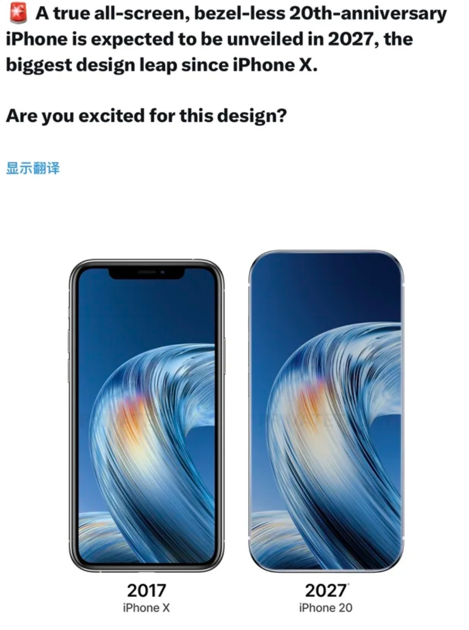 从刘海到灵动岛,再到这次曝光的无开孔全面屏,苹果被说挤牙膏太久了。如果20 周年纪念版真长这样,你会为设计买单吗?