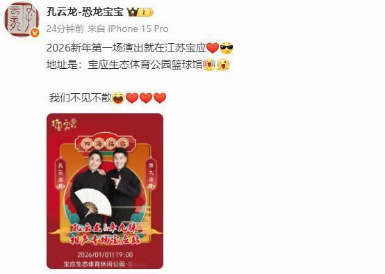 三哥孔云龙还真是被师父郭德纲器重!德云社2026年第一场商演出炉,孔云龙将在江苏宝应生态体育公园篮球馆举办相声专场。德云社新年第一场演出,还在体育馆,含金量是非常足的。而从三哥孔云龙的文案也可以感受到,三哥对这个安排,是满意的,是开心的,是兴奋的。孔云龙是郭德纲第一批云字科徒弟,经过赵铁群先生的介绍和郭德纲结识,并与岳云鹏同一天到德云社。原本,郭德纲是有意捧孔云龙的,但由于孔云龙运气不佳,老是受伤错过,机会也就给了岳云鹏。