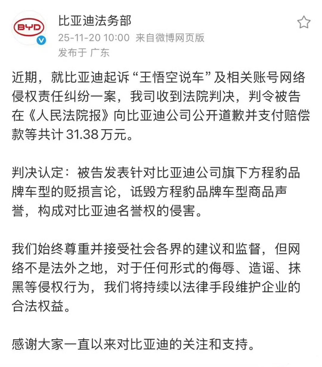 比亚迪法务部发来战报,先前被封禁的“王悟空说车”目前已经被法院判决,需要公开道歉并且支付赔偿比亚迪损失31.38万。 ❤️