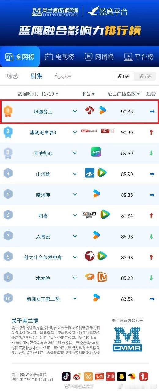 恭喜任嘉伦《凤凰台上》拿下美兰德热播全网剧集融合传播指数榜第一萧焕太优秀了