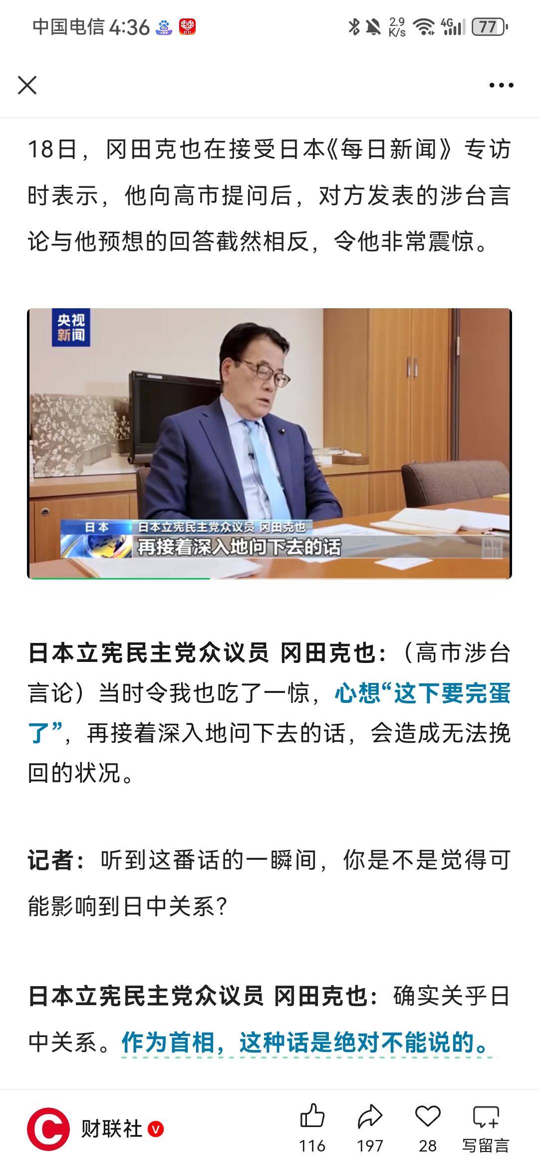 财联社11月20日报道,日本众议员冈田克也,就是之前向高市早苗追问所谓“台湾有事”在怎样的情况下,构成“存亡危机事态”的那个人,最近接受了记者采访,谈到了自己当时的心理感受,直接毫不客气说道:“当时令我也吃了一惊,心想‘这下要完蛋了’,再接着深入问下去的话,会造成无法挽回的状况。”“作为首相,这种话是绝对不能说的。” 由此可以看出,一个正常的、理智的政客,他其实是知道底线在哪里的,知道什么该说,什么不该说,高市早苗毕竟也在日本政坛混了那么多年,她不可能不知道底线在哪里,结果竟然还是以首相身份,当众做出了那样的发言,这只能说明她这并不是什么口误,她就是故意的,是怀揣着深深的恶意。这样的一个政客,必定将日本带向一个不好的结局。