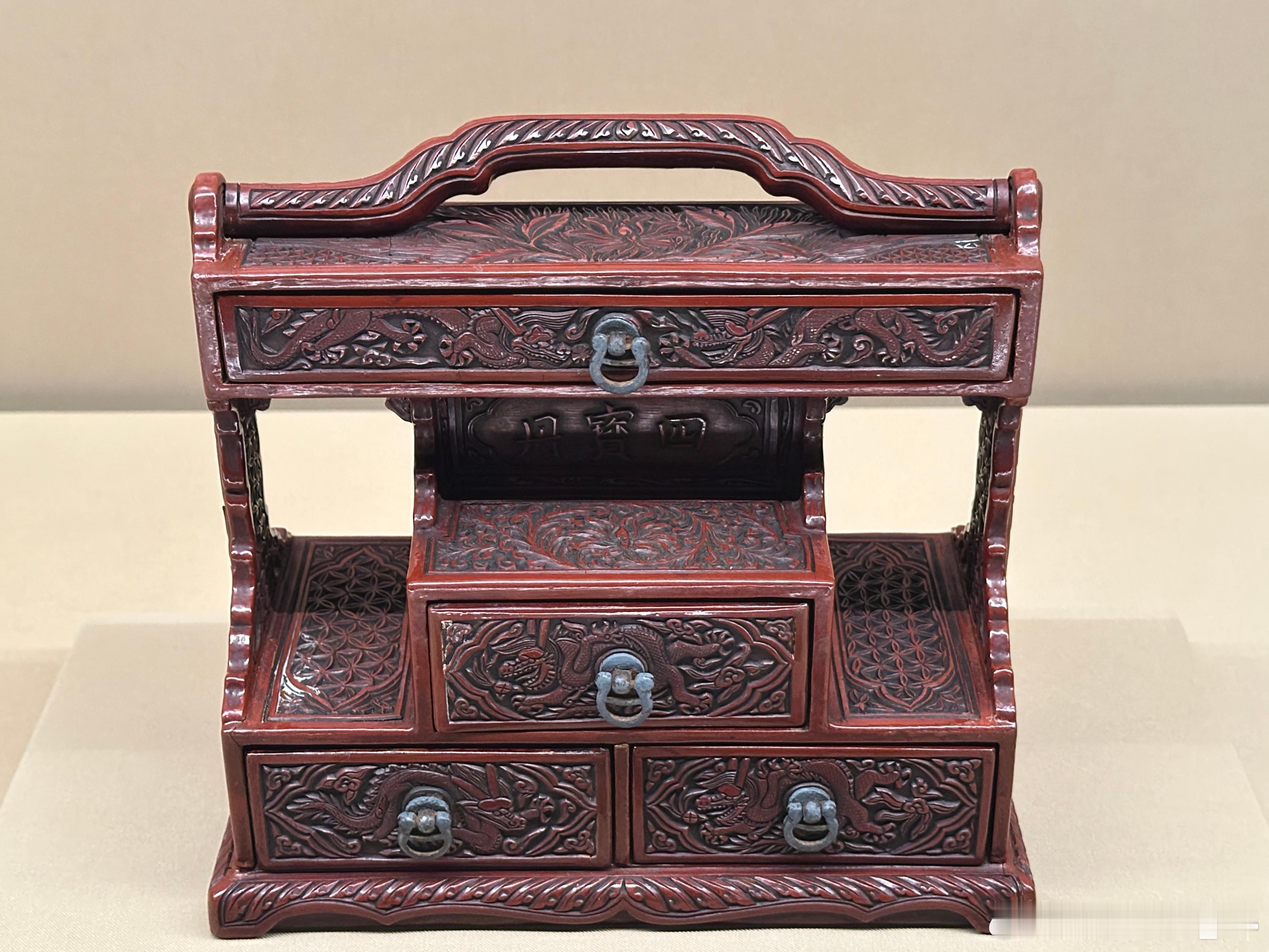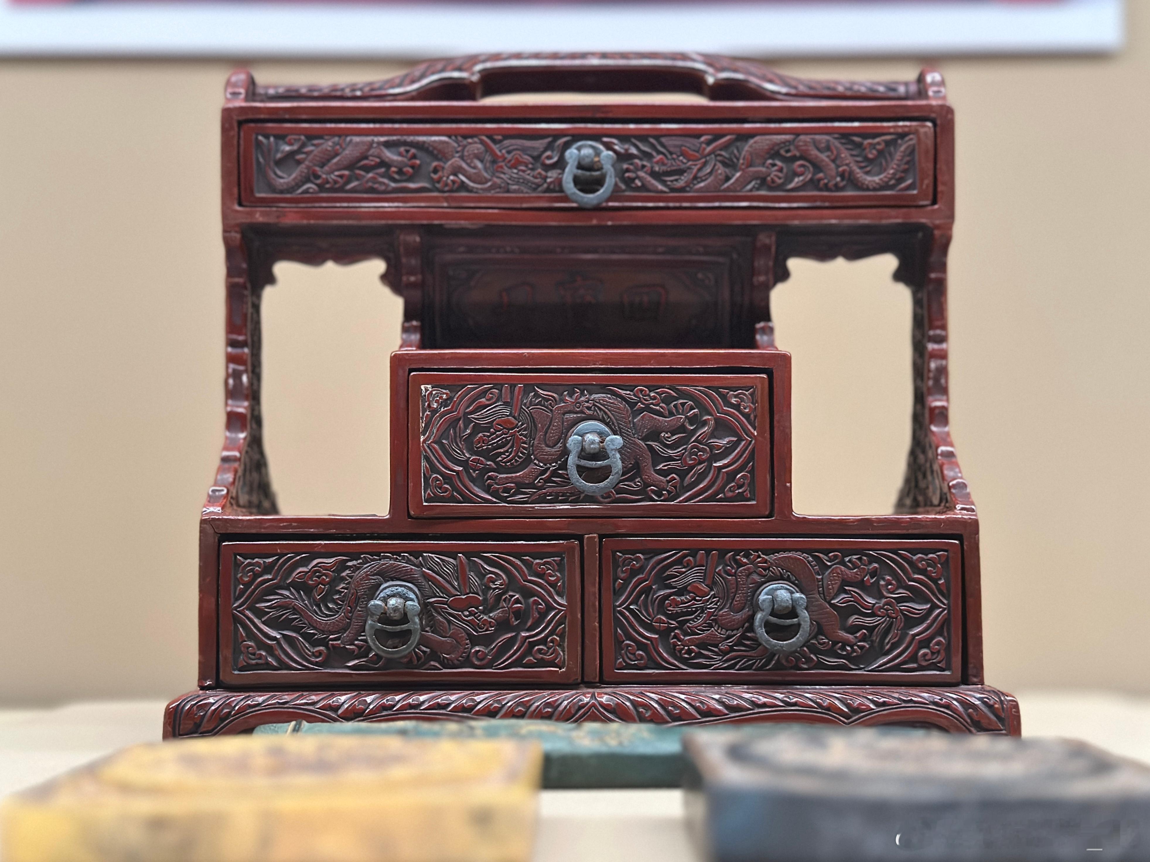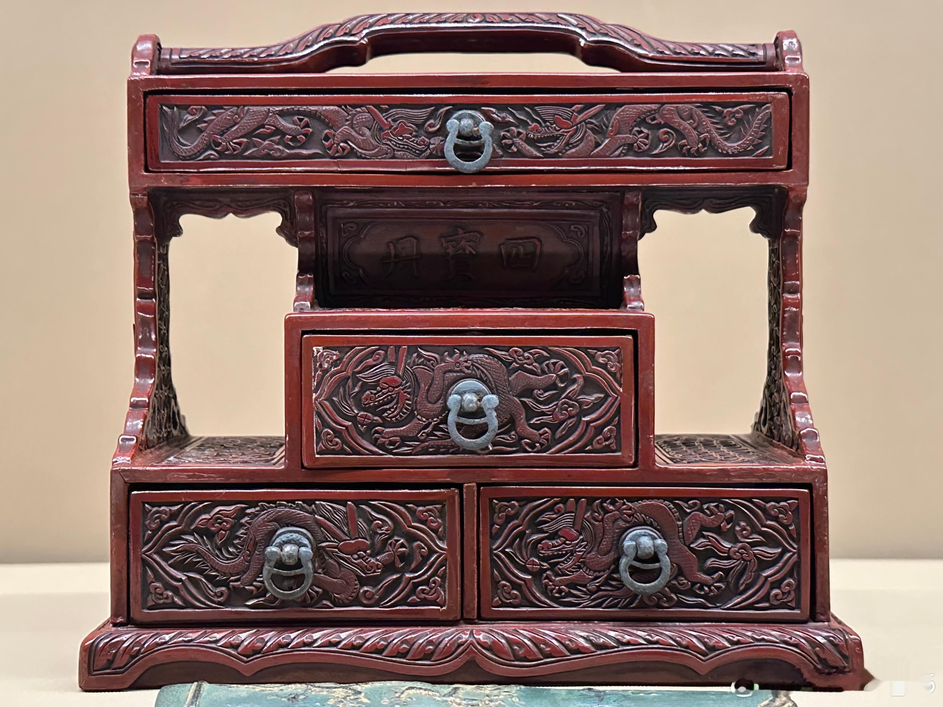 剔红龙纹墨柜明隆庆年16世纪永青文库藏木胎,长方形提梁柜,外髹朱漆内髹黑漆。柜面雕朱漆龙纹、云纹、花卉纹等。柜体为三层四屉结构。屉面均以龙纹为主,辅以云纹。屉中部均有金属提环。提梁和柜足雕叶纹。上面两层抽屉之间的横枋上刻“四宝丹”字样。柜背以牡丹纹、卷草纹为主,间饰锦文等纹饰;最上层的屉背开光内刻“大明隆庆年制”款。左右两侧雕花草纹。柜底髹朱漆,中央刀刻填金“大明隆庆年制”楷书竖款。此柜应为盛放“大明隆庆年制”四锭墨定制。最上层屉内置琴式绿墨一方,下面二层三屉中分别置方形黑、黄、朱墨各一锭。墨锭正面均雕龙纹,背刻“龙香御墨 大明隆庆年制”。 展出摄于上海博物馆