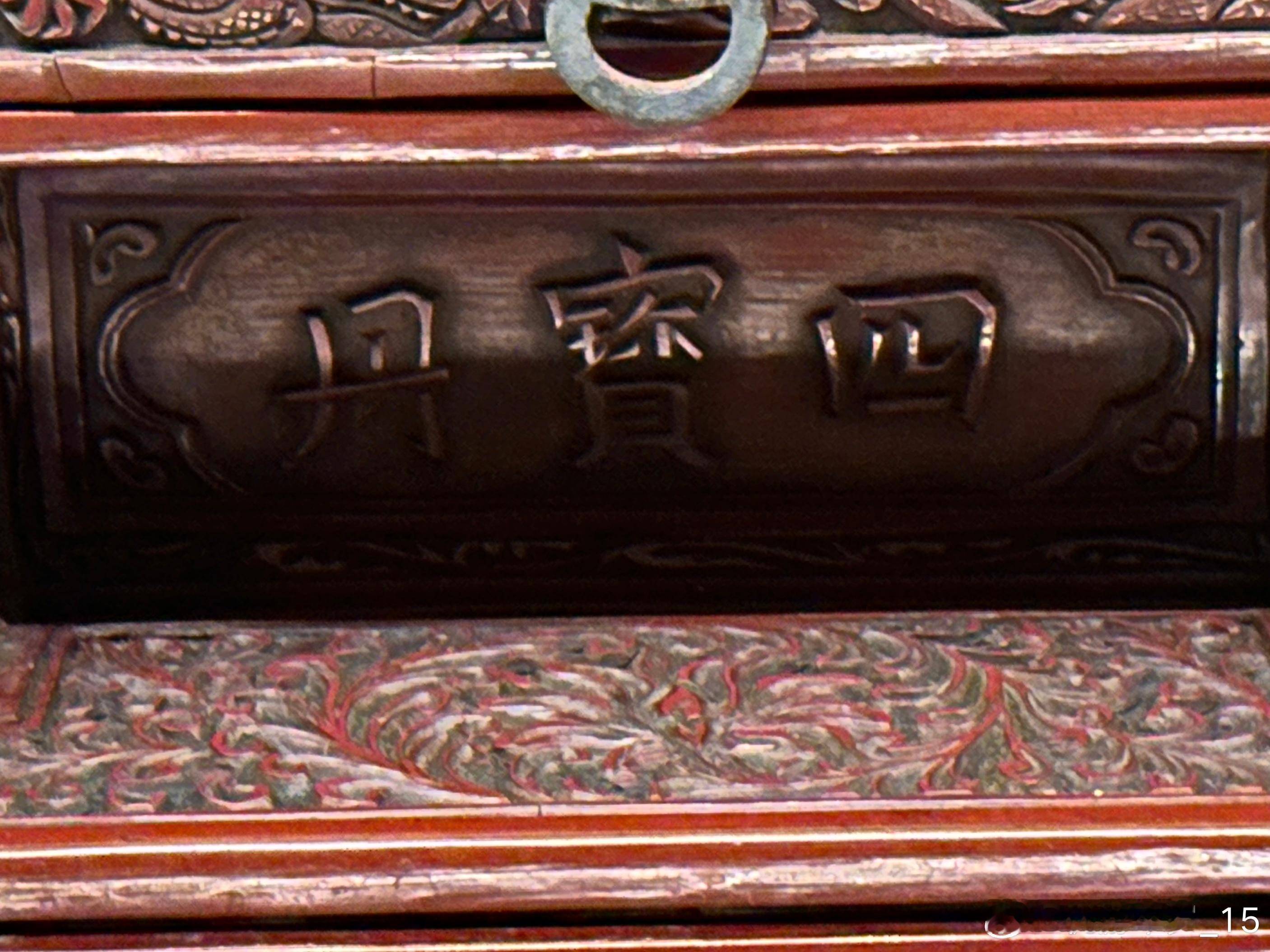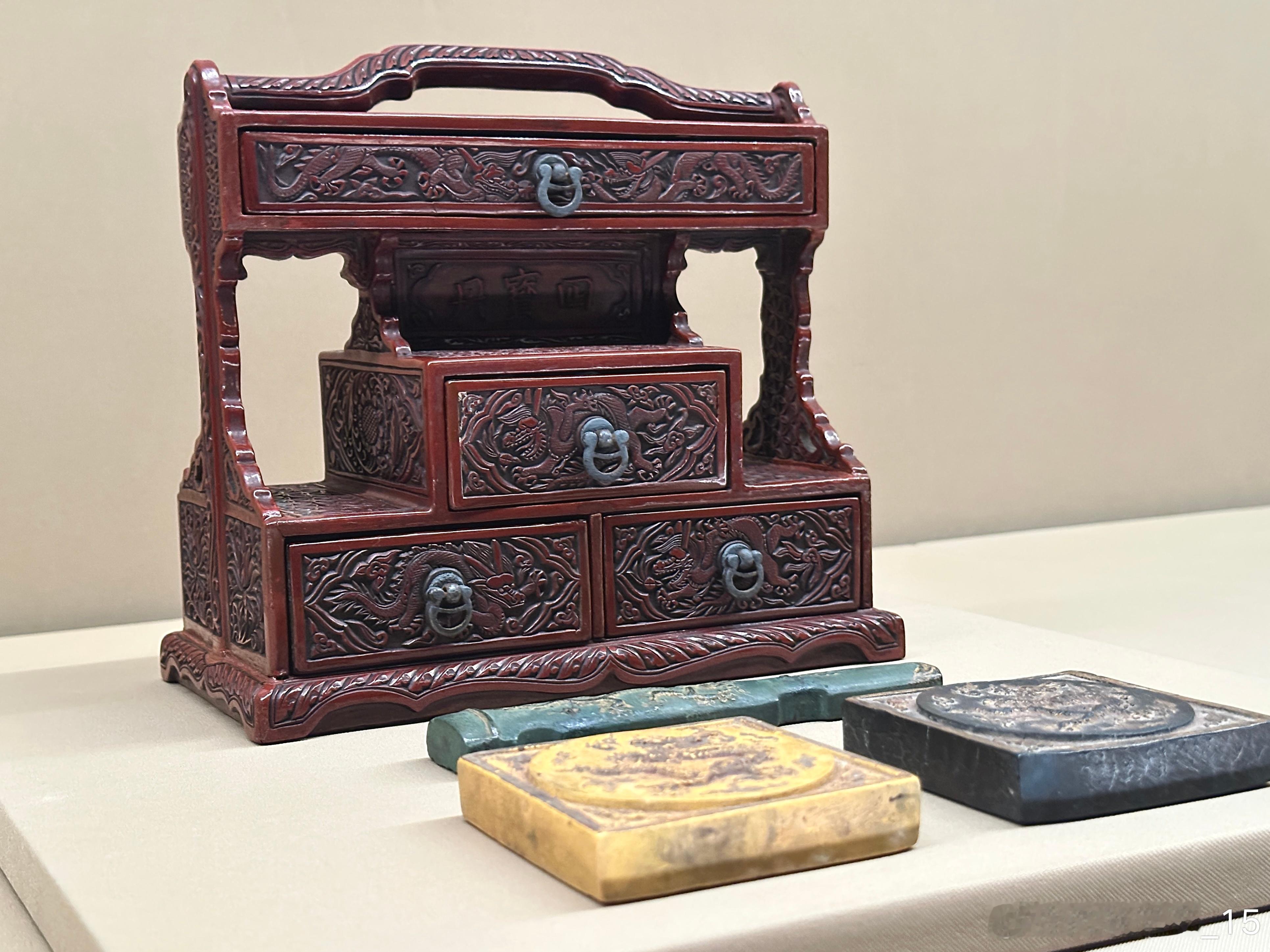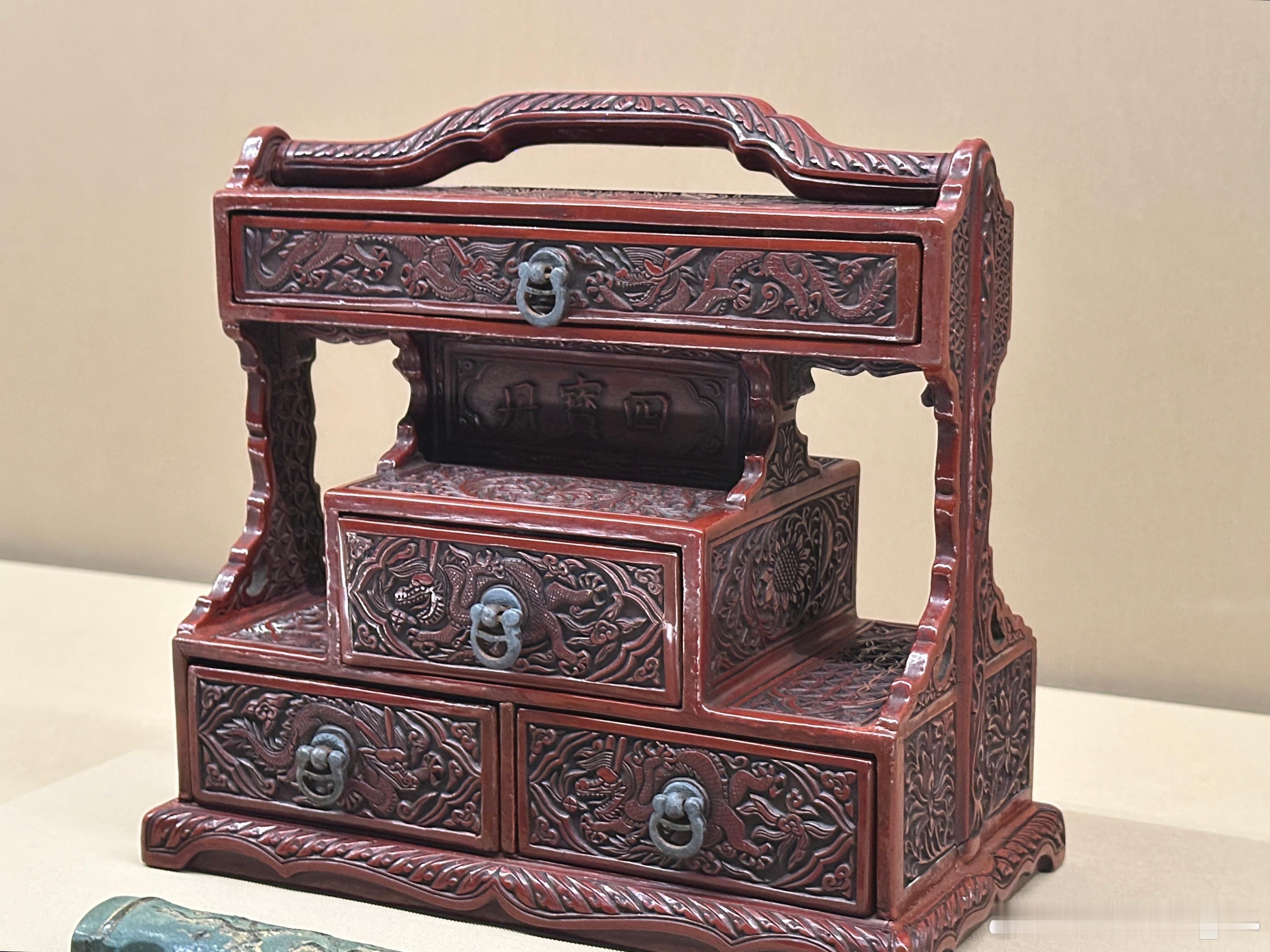 剔红龙纹墨柜明隆庆年16世纪永青文库藏木胎,长方形提梁柜,外髹朱漆内髹黑漆。柜面雕朱漆龙纹、云纹、花卉纹等。柜体为三层四屉结构。屉面均以龙纹为主,辅以云纹。屉中部均有金属提环。提梁和柜足雕叶纹。上面两层抽屉之间的横枋上刻“四宝丹”字样。柜背以牡丹纹、卷草纹为主,间饰锦文等纹饰;最上层的屉背开光内刻“大明隆庆年制”款。左右两侧雕花草纹。柜底髹朱漆,中央刀刻填金“大明隆庆年制”楷书竖款。此柜应为盛放“大明隆庆年制”四锭墨定制。最上层屉内置琴式绿墨一方,下面二层三屉中分别置方形黑、黄、朱墨各一锭。墨锭正面均雕龙纹,背刻“龙香御墨 大明隆庆年制”。 展出摄于上海博物馆