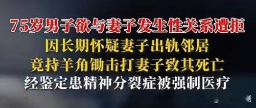 七十五岁的程某,怎么也没想到,和自己过了大半辈子的妻子,会死在自己手里。 同一个屋檐下,两人分房睡很久了。那天晚上,他喝了酒,一时冲动想亲近妻子,却被一句“老不正经”冷冷拒绝。退回房间,多年的猜疑像野草一样疯长——他总觉得妻子和邻居有染。一气之下,他抡起羊角锄,朝熟睡的妻子狠狠砸去。 事后司法鉴定出炉:程某患精神分裂,作案时正在发病,依法不负刑事责任。不用坐牢,但也不等于“没事”。检察官申请对他强制医疗,法院同意了。 为什么?因为他病没好,妄想症状还在,放回社会可能再次伤人。强制医疗不是惩罚,是治病,也是保护大家的安全。 一场悲剧,毁了一个家。如果早一点察觉他的精神异常,如果家人之间多些沟通,也许结局会不一样。可惜,生命没有如果。