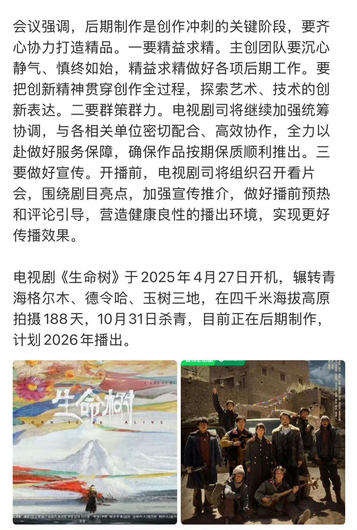 生命树从开拍前到拍摄中,从制作后期到播出前,完全一条龙的都被宠着,刚杀青就开展指导工作,《生命树》是广电总局重点指导项目!期待2026年播出