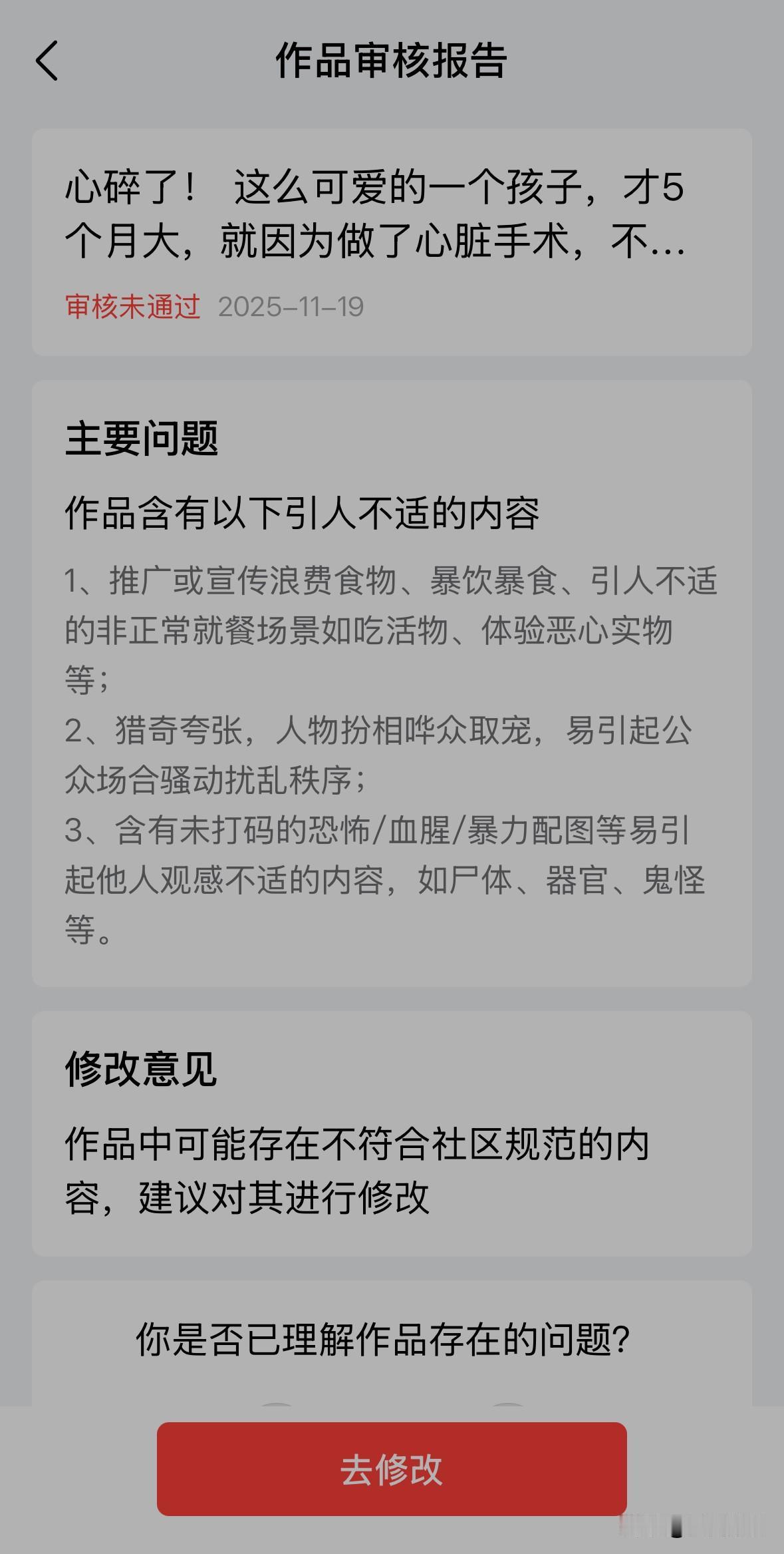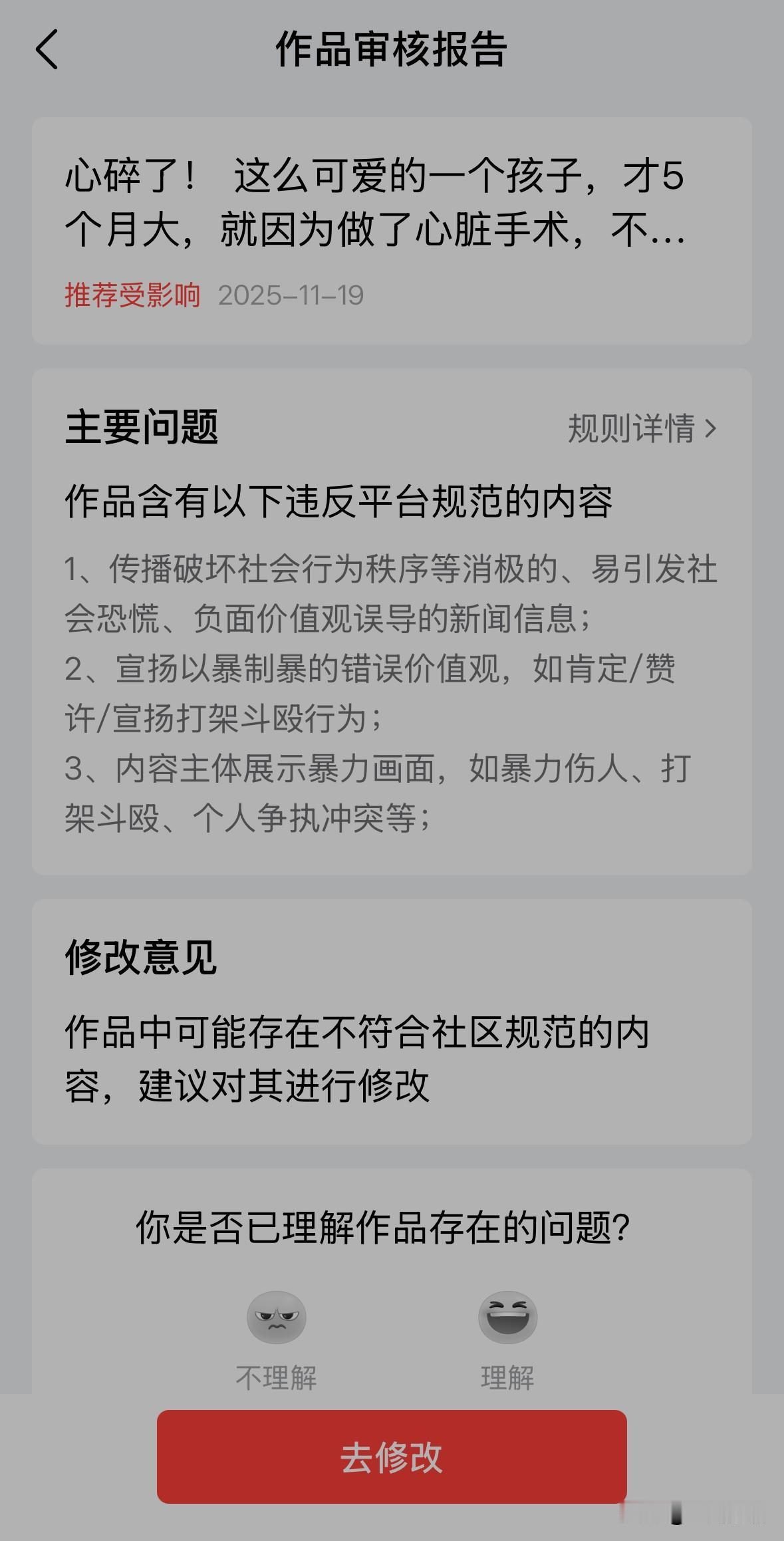 又涨知识了! 昨天发了一篇关于小洛熙的文章,今天早上提示我存在消极的情绪引导,让我修改,否则只能推送给粉丝;我删除了一些自认为敏感的词汇,修改完再次提交审核,结果变成了不通过!说我宣扬不良价值观。我苦思冥想,这也没有宣扬什么呀!后来我突然意识到,可能是我配的图有问题,有一张图片是小洛熙妈妈抱着她,她身上已有大片黑紫的照片。我赶紧把这张照片删除了,再次提交审核,又变成了限制推荐。我想了想,把小洛熙浑身插满管子抢救的照片也删除了,这次终于审核通过了。 看来,发布可能引起人观感不适的图片,得三思而后行了,否则就是违规,我已经不小心踩了好几次雷了!不知道这影不影响我创作营第二周30元的奖励啊?[捂脸] 小洛熙