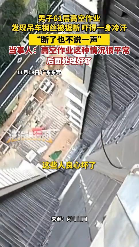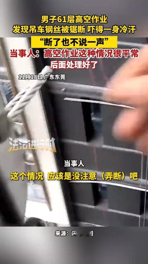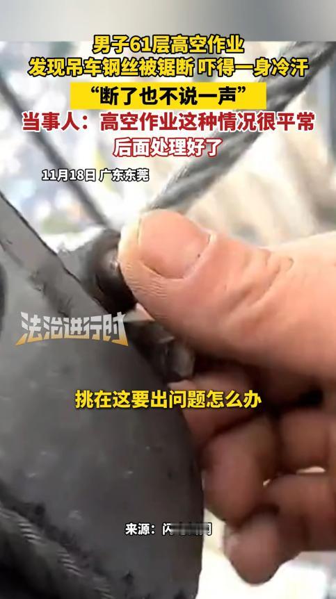 “这是谋杀!”11月18日,广东东莞,一工人在61层高空作业时,发现吊车的钢丝绳被人割断,还用螺丝挑着,气得他直呼“良心坏了”!幸亏男子检查的及时,这才没有发生意外,之后更换新的绳索继续作业。网友:这简直是谋杀! 45岁的“蜘蛛人”陈师傅像往常一样,准备进行外墙清洗作业。他熟练地将吊篮收回顶楼,刚要跨进去,突然觉得手中的钢丝绳手感不对劲,本该紧绷的钢索,末端竟有一丝异样的松动。 凑近一看,陈师傅后颈瞬间冒起冷汗:钢丝绳表面的塑料保护层被利器割断,内部的钢丝只剩几根勉强连着,更让人发毛的是,断口处还被一颗螺丝钉刻意挑起,形成一个伪装的“临界点”。 只要吊篮下坠受力,这根承载着他生命的“生命线”随时会彻底断裂。61层高空,一旦坠落,后果不堪设想。 陈师傅从业15年,早已养成了作业前“三遍检查”的习惯:先查吊篮卡扣,再试制动装置,最后必摸钢丝绳。正是这个习惯,让他在死神手里抢回一条命。“当时脑子‘嗡’的一声,腿都软了。” 他后来在视频里回忆,手指抚过断口时,能清晰摸到锐器切割的锯齿感,“这不是意外磨损,就是有人故意下黑手。” 更让人心惊的是,陈师傅说这种情况“很正常”。这些年在高空作业,他遇到过钢丝绳被晒得老化、卡扣被雨水锈蚀,但人为破坏还是头一回。 短暂的惊恐后,他没有选择报警或者停工,而是默默从工具包取出备用钢丝绳更换。“家里两个孩子还等着学费,这一单要是丢了,这个月房贷都悬。”他的语气里透着无奈,仿佛这种游走在生死边缘的威胁,早已成为职业常态。 事件曝光后,网友的愤怒如潮水般涌来。大家这才意识到,割钢丝绳不是恶作剧,而是涉嫌犯罪的危险行为。根据我国法律,在高空作业区域故意破坏安全设备,即使未造成伤亡,也可能构成“以危险方法危害公共安全罪”,最高可判十年有期徒刑。 如果导致人员重伤或死亡,更是面临无期徒刑甚至死刑。 这不是危言耸听。2017年郑州曾有案例:居民因不满外墙施工,用菜刀砍断工人安全绳,致其坠楼重伤,最终被判处有期徒刑九个月。而东莞这起事件中,割绳者选择在61层高空对承重绳下手,主观恶意明显,法律后果只会更严重。 陈师傅的遭遇,撕开了高空作业行业的残酷一角。这些“蜘蛛人”每天挂在几百米高空,靠每平米几毛钱的清洗费养家糊口。他们的安全保障,往往只有一根钢丝绳、一个安全卡扣,却要面对风吹雨淋、设备老化,甚至人为破坏。 视频里,陈师傅换好钢丝绳后,又一次翻身坠入高空,身影在玻璃幕墙上显得格外渺小。网友这才发现,他的工作服早已磨得发亮,安全绳的保护层也补丁摞补丁。“不是不想用新设备,一套合格的高空作业装备要好几千,我们小包工头根本舍不得买。” 陈师傅的一句话,道破了底层劳动者的辛酸,他们不是不怕死,而是被生活逼得不得不把命拴在一根绳上。 事件发酵后,除了对割绳者的声讨,更多人开始关注:能不能让机器人代替人工高空作业? 科技早已在尝试“接棒”。深圳研发的桥梁缆索检修机器人,能模仿蜘蛛攀爬,携带传感器检测高空设施;山东的幕墙清洗机器人,不仅能抗风防坠,还能自动规划清洗路径,效率比人工高3倍。 这些智能设备的出现,让人们看到希望:或许不久的将来,高空作业不再依赖“人肉身悬”,而是由机器人完成高危操作。 但现实是,这些设备造价高昂,普及到中小施工队还需时间。正如陈师傅所说:“我们也知道机器人安全,但现在每天赚的钱,刚够全家糊口,哪有钱买那‘铁家伙’?” 事件最终以警方介入调查暂告一段落,但留给社会的思考远未停止。陈师傅的“习惯性检查”救了自己,却暴露了行业监管的漏洞,如果每个工地都能强制落实作业前的安全检查,如果物业能提前告知居民高空作业情况,或许悲剧就能避免。 更重要的是,割绳者的行为敲响了法律警钟:任何矛盾都不该成为危害他人生命的借口。正如一位法律博主所说:“高空作业的钢丝绳,既是工人的‘生命线’,也是社会安全的‘警戒线’,触碰这条线,法律必将严惩不贷。” 站在地面仰望高楼,那些悬挂在半空的身影,是在用生命为城市“梳妆”。他们的安全,需要法律的“铁绳”守护,需要科技的“铁臂”替代,更需要每个人心中的安全意识与法治观念“绷紧”——毕竟,没有哪份工作的报酬,值得用生命去交换。 信息来源:《男子61层高空作业 发现吊车钢丝被锯断 吓得一身冷汗 “断了也不说一声” 当事人:高空作业这种情况很平常 后面处理好了》法治进行时