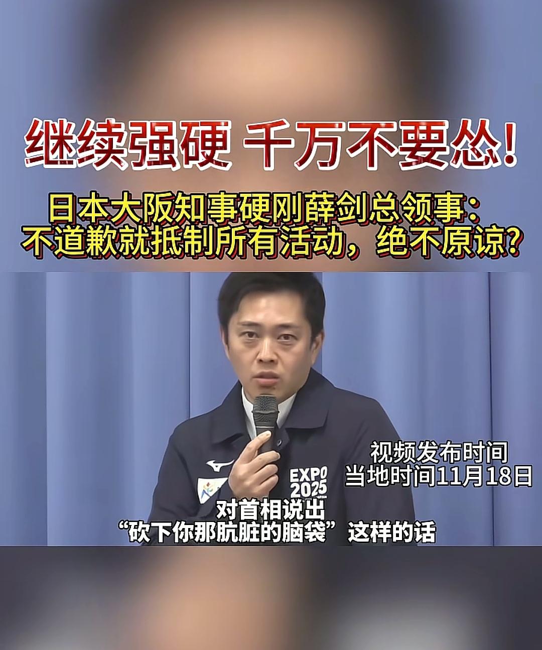 希望你们一直这么强硬下去,别到时候跪地求饶!这不止是薛总领的个人意思,而是中华民族14亿人的意思,薛领事说的对,人不犯我我不犯人,你不把脏头伸过来会斩了你的头吗?中国不会轻易让你们得逞,要钝刀子割肉,禁水产、断游客、控稀土、这些精准反制日本能扛住吗?我们拭目以待!