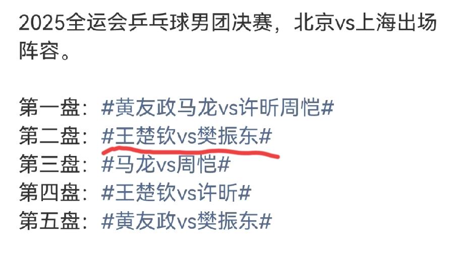 全运会乒乓球男团决赛对阵形势已出,北京队王楚钦和上海队樊振东都是作为一号种子出赛,所以他俩都要打两场单打,第一场是双打,第二场就是他俩的强强对决。 大家看看这个“田忌赛马”的排兵布阵,哪个队更强一点?你更希望哪个队胜出。 看了一下各大评论区,至少2/3的网友是希望上海队获胜的,我也不知道是咋回事,可能樊振东的人气更高一点吧!