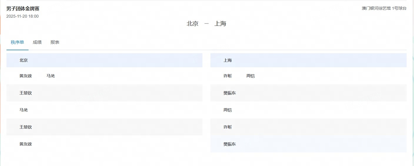 压轴对决!今晚18:00,全运会乒乓球男子团体金牌赛打响,北京与上海争冠,马龙、王楚钦、樊振东、许昕四位奥运冠军领衔出战。【双方对阵公布】第一盘:黄友政/马龙 VS 许昕/周恺第二盘:王楚钦 VS 樊振东第三盘:马龙 VS 周恺第四盘: 第五盘:黄友政 VS 樊振东