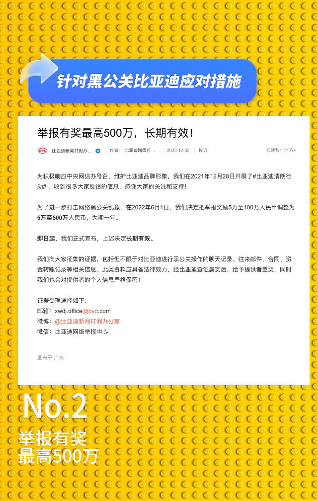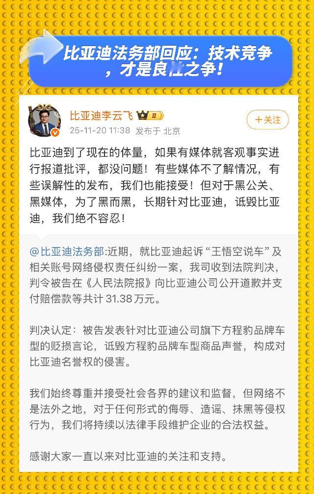 比亚迪法务部硬气发声: 技术竞争才是良性之争(真刀真枪的技术比拼,才是行业该有的样子!)咱支持比亚迪,不是盲目护短,合理的批评、真实的建议,车企该听也该改。但那些为了黑而黑的网络黑嘴、黑公关,拿着编造的谣言、曲解的常识反复抹黑,把网络当发泄场、造谣当生意做,这事儿绝不能忍!网络从来不是法外之地,比亚迪早就亮明态度: 500万悬赏线索、起诉造谣账号胜诉获赔上百万、涉事博主被行政拘留,这一系列操作就是要告诉所有人: 恶意诋毁不是流量密码,抹黑他人也不是竞争捷径。对这些无底线的黑公关、黑媒体,必须一追到底! 只有把歪门邪道的路堵死,让技术创新、产品实力成为竞争核心,行业才能良性发展,消费者也能看清真相、选到好车。 支持比亚迪维权,更支持干干净净的市场环境!