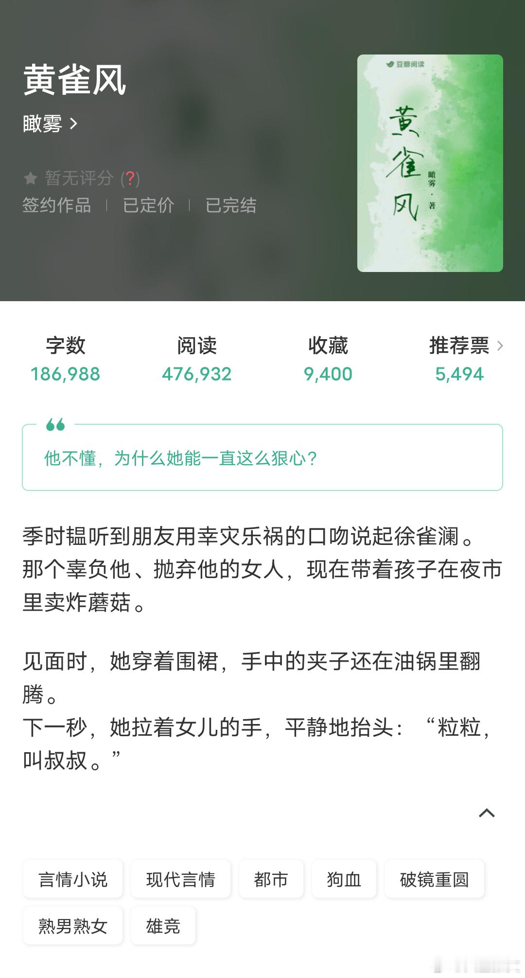 《黄雀风》作者:瞰雾带球跑,破镜重圆,狗血,一点点悬疑这本小说癫癫的,男主阴湿敏感超级恋爱脑,男主季时韫从小父母离异,养在爷爷奶奶膝下,对亲密关系的感知非常敏锐,跟女主中学开始交往,分手前几个月女主变得冷淡,早出晚归,男主觉得外面有人勾引女主变心了。很快女主提出分手,男主心里煎熬痛苦,抛下尊严,低三下四地求女主不要离开,一遍遍地在床上确定女主还在身边,两人疯狂做ai,在一次大汗淋漓后,趁着男主入睡,女主离开了。男主醒来身边空无一人,女主的东西都搬走了。男主去看医生确诊严重失眠焦虑,脑子里全都是女主,越想越痛苦,只能用工作麻痹大脑,白手起家,创业成功。男主快要被思念折磨疯了,从朋友那里得知女主带着孩子摆摊卖炸蘑菇,且旁边小摊摊主就是女主未婚夫。小说开篇即重逢,男主直接杀到女主摆摊的地方,跟踪一个月才现身,硬气地说了一句“大份,带走”。看到女主冷漠淡然的样子,男主装得心都碎了。为了接近女主和孩子,男主搬到女主家楼上,晚上偷偷拔掉女主电动车充电线,然后借口顺路送孩子上学。为了让女主早点收工,男主招女群演排队买炸蘑菇。让男主崩溃的是,女主不仅有未婚夫,还有每周来买一次炸蘑菇的前男友。女主因原生家庭不幸,对感情缺乏信任。后来男主发现有警察调查女主,跟多年前女主爸被火烧死有关。女主为了应付警察利用男主,默许男主靠近,男主很满足很开心自己还有利用价值。两人做ai,看到女主从家里拿的中号套套,男主心里发疯吃醋,但男主不敢不能质问。女主什么都不做,只是呼吸,对男主就是引诱。男主每天也很忙,丢下公司照顾老婆孩子,洗手作羹汤,防着小三小四来勾引女主。然后发现女主秘密,女主曾经给被家暴的女性朋友出主意,用一场大火烧死施暴者。男主发现真相后主动参与女主计划,甚至留下证据,万一哪天出事了替女主顶罪。这本后面还有几个男人,竹马哥哥,一个比一个变态的双胞胎弟弟,最后女主说出埋在心底的秘密,承认男主是孩子的亲生父亲,一家三口在一起。两人分手原因:男主性格偏执,把感情看得太重,而且男主很聪明会伪装。女主认为男主不适合成为丈夫,成为父亲,于是分手。这本女主清醒理智,很会训🐶,男主阴湿敏感超级恋爱脑,善妒,内心戏丰富,癫公。