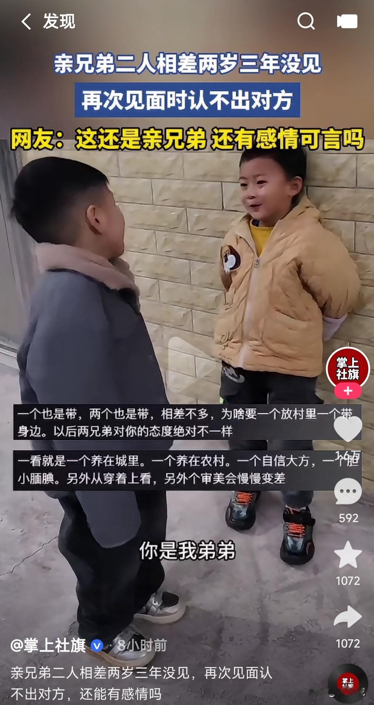 亲兄弟二人相差两岁3年没有见面,再次见面时竟然认不出对方,这样的亲兄弟还有感情可言吗?实在不明白为什么一个放村里,一个放城里? 老话说一只羊也是放,一群羊也是放,实在搞不明白为什么要把相差2岁的兄弟两分开养?这样分开养大的孩子彼此之间还有感情可言吗?才3年时间没见彼此就已经不认识对方了,这无疑和陌生孩子有什么区别? 不管是从穿着上看,还是从神态上看,两个孩子的区别截然不同,在城里生活的孩子自信大方,穿着得体,在农村生活的孩子性格腼腆,并且穿着随意,不知道分开养大的孩子,兄弟两以后对待父母的态度会一样吗?