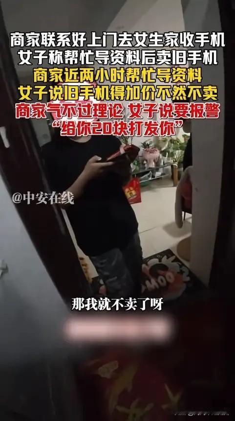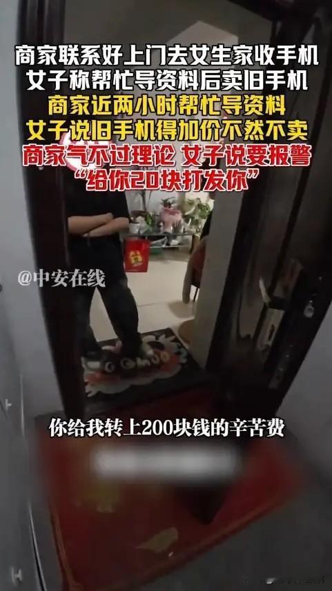 “太缺德了!”新疆,一女大学生联系卖手机的老板,想要以旧换新,双方商量好了回收价后,老板提着新设备来到女生家,女生先是说不在他这里买了,随后又让老板站在门外导了一个多小时的资料,最终又临时涨价!网友:就是想白嫖! 新疆乌鲁木齐经营二手手机生意的老板小张突然接到一个女大学生的单子,对方说要用手上的旧手机换台新的,价格都谈妥了,2800元,小张觉得这单生意挺稳当。 他大老远提着新手机赶到女生家门口,没想到对方突然改口说不换了,小张心里想着白跑一趟不说,还搭进去不少时间。女生接着说旧机还是想卖,但得麻烦小张帮忙把资料导到她的新手机上。 小张犹豫了一下,看她一个学生可能真不太会弄这些,心一软就答应了。他站在楼道里开始操作,女生砰的一声把门关上了。新疆冬天楼道里挺冷的,小张和助手在外面冻着手导数据,女生在屋里好像还睡了觉。 一个多小时后资料导完了,女生开门第一句话不是感谢,而是挑刺说速度太慢。紧接着她突然提出要涨价,说别人报价更高,硬要小张加钱才肯交易。 小张最后无奈离开,白忙活三小时,事后女生虽然道了歉还转了100元补偿,但小张没要。他觉得诚信经营才是长久之道,虽然这次吃了亏,但不能因为个别人坏了做生意的原则。 二手交易无论是商家还是顾客,都得将心比心,商家别玩虚的,顾客也别总想着占便宜,这样市场环境才能越来越好。 各位读者你们怎么看?欢迎在评论区讨论。