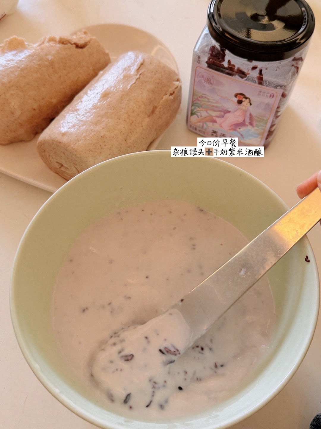 今日份早餐 杂粮馒头和牛奶紫米酒酿~终于天晴了 带小狗去洗一下 脏兮兮的