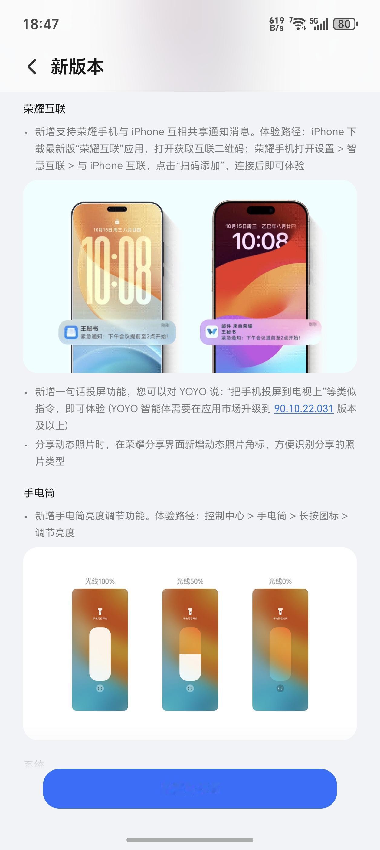 荣耀Magic8 Pro116更新包来了,文件挺大,优化了拍照、新增支持与iPhone互相共享通知信息、手电筒调节亮度等。