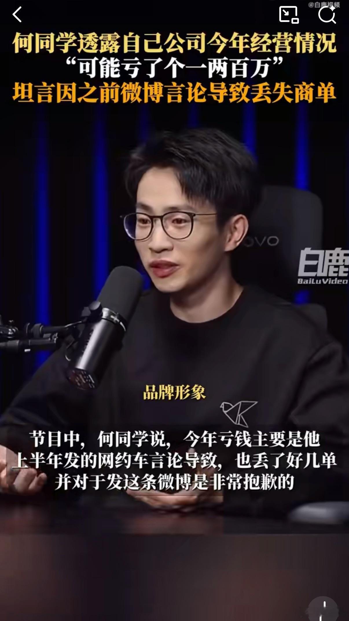 何同学说,因为上半年的网约车言论导致丢了好几单商单,然后公司今年亏钱了。他本人非