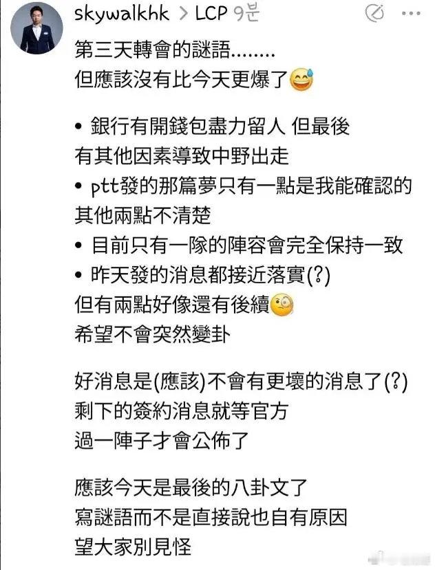 LCP赛区爆料:队伍花大价钱挽留 但两人希望更换上辅教练人员昨日LCP赛区战队CFO官宣中野二人离队,而今日凌晨同属LCP赛区的FAK战队教练更新个人脸书透露中野二人离队细节:CFO并非未对二人进行挽留而是提出高价合同,但两人对目前队伍阵容感到不满;要求更换上路、辅助、以及教练位置的成员才会考虑留队。