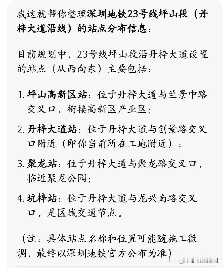 丹梓大道以后要有地铁站了吗? 今天送娃上学回来路过丹梓大道,发现有个地方挂上了深圳地铁的牌子,还能看到深圳都市圈动车城轨项目之类的字样,看上去像要建地铁站的样子。 地址就在锦绣华晟家园前面一点,丹梓大道上面,离我们大亚湾的家很近了只有两公里左右,要是真能开工建地铁那就好了。 之前有听说,深圳19号线会在生物医药产业园附近建个聚龙东站,有可能就是这个位置,但是我ai查了一下。 结果说是深圳地铁23号线的站点,23号线是从龙岗到坪山再到大鹏的线路,有经过丹梓大道这边,但是都是很久以后的规划了。 我发给老公看了一下,他说应该是附近地铁站建设的项目基地,指挥之类的,但是估计是为后续的地铁建设做准备。 就是不知道是不是深圳地铁23号线了,不过等等看吧,坪山以后会多几条地铁线的,现在只有14,16号线,太少了。 和深圳西边比起来,坪山的地铁线路太少了,以后估计能多建几条线路,以后交通只会越来越便利的。