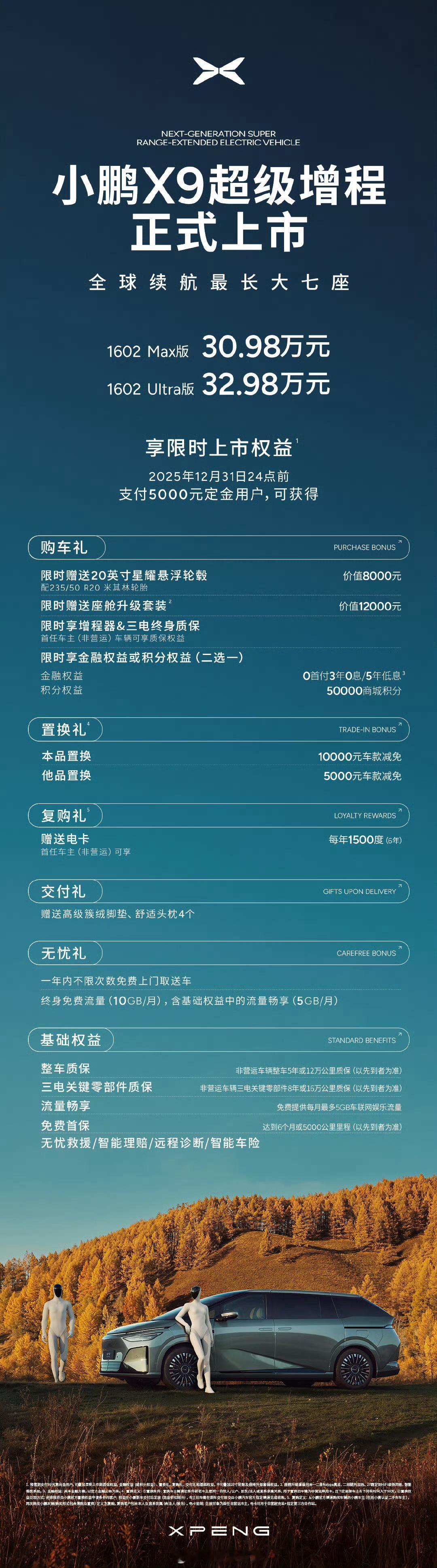 小鹏X9超级增程正式上市!-1602Max版30.98万元;-160