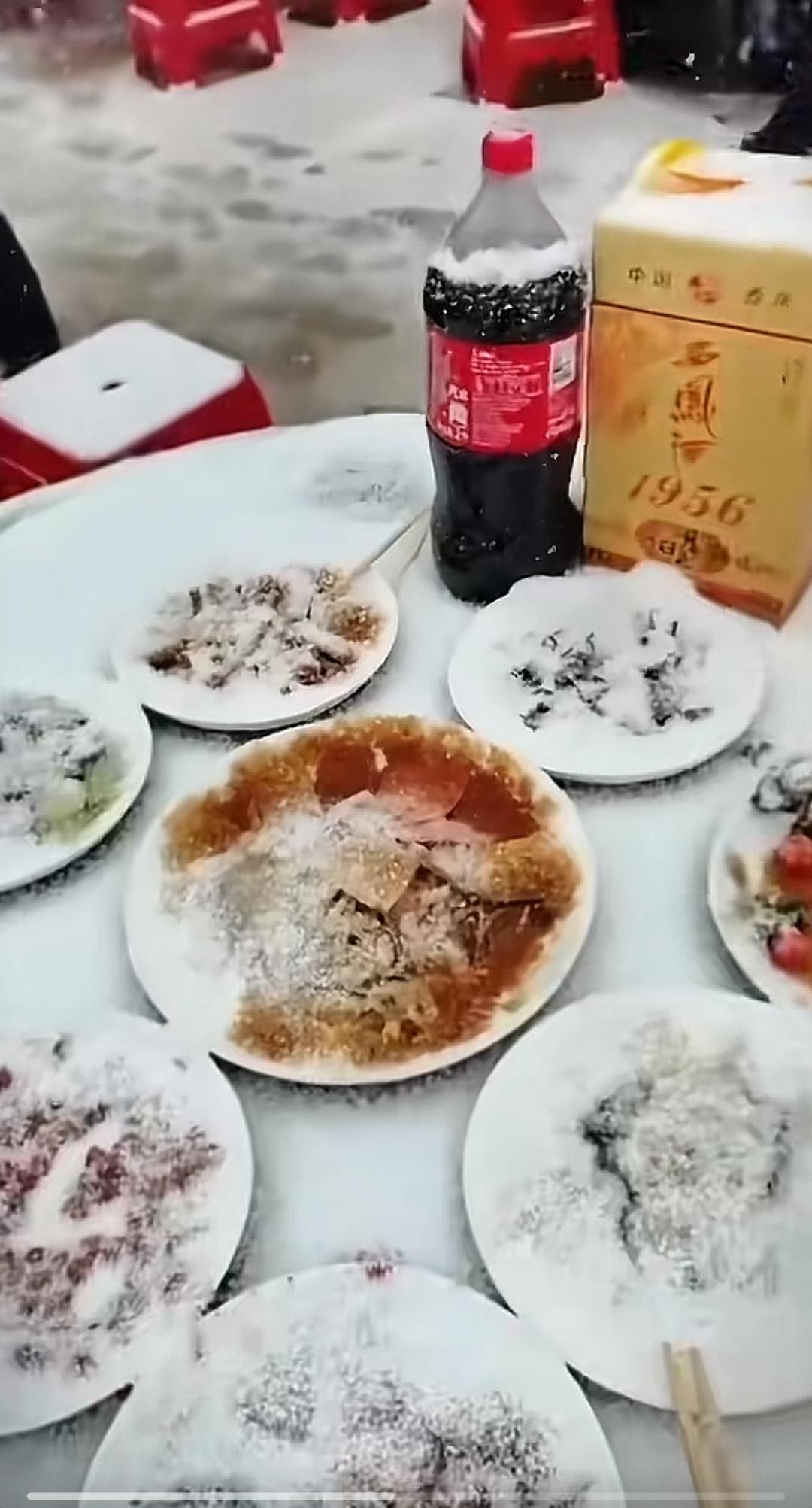 不管多冷,八个凉菜,是不是真的?是真的。 但是不是在下雪的时候也要吃?也的确是的! 但如果在户外的话,现在都会搭棚的,不会让雪直接下在菜里面,不然咋吃? 一般来讲呢,就是先吃凉菜,因为要喝酒嘛,所以就是凉菜加酒,然后吃的差不多了,酒喝的差不多了,开始上热菜,热菜到最后再配馒头就结束了。 反正陕西关中地区是这样的!