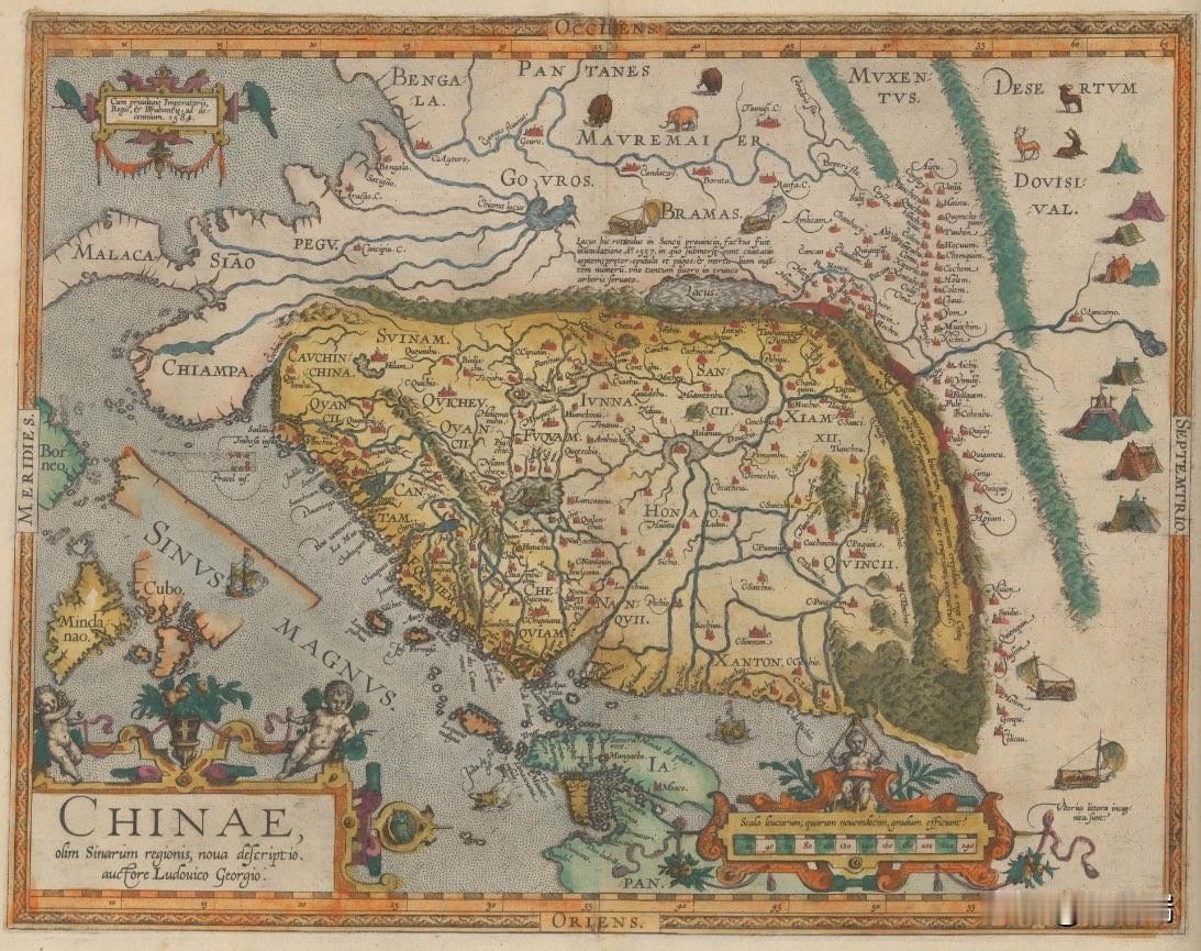 地图作者: 阿伯拉罕·奥特利乌斯 (Abraham Ortelius),他被公认为第一部现代地图集《世界概貌》(Theatrum Orbis Terrarum) 的创作者。 制图来源: 该地图基于葡萄牙人路易斯·豪尔赫·德·巴尔布达 (Ludovicus Georgius) 的一份手稿地图。 首次出版于 1584 年的地图集补充版中。 这是第一张出现在西方地图集中的中国地图,在当时是西方世界关于中国最准确的地图。它在接下来的六十多年里一直是中国内陆地图的模板。 地图特色 方向: 地图的方向朝西,即北侧位于图面的右侧。 细节: 它描绘了当时中国的十五个省份,并详细标注了约 240 个城镇。 地理元素: 图中清晰可见长城(但长度被大大低估,仅标注为 400 英里)、台湾岛(福尔摩沙)、黄河和长江。 装饰: 地图装饰丰富,包括鞑靼人帐篷的插图、帆船、比例尺和特权标题的装饰性边框。右上方和上方还描绘了风力四轮马车,这可能是该装置在欧洲印刷品中的最早描绘之一。 背面文字: 地图背面包含拉丁文文字,其中首次包含了西方印刷品中的汉字转录。